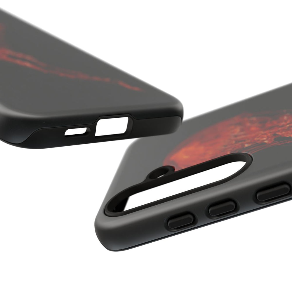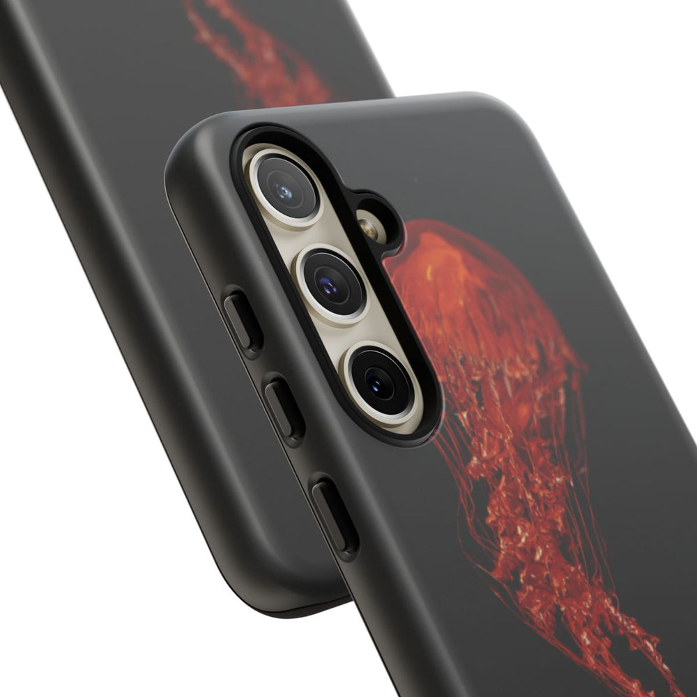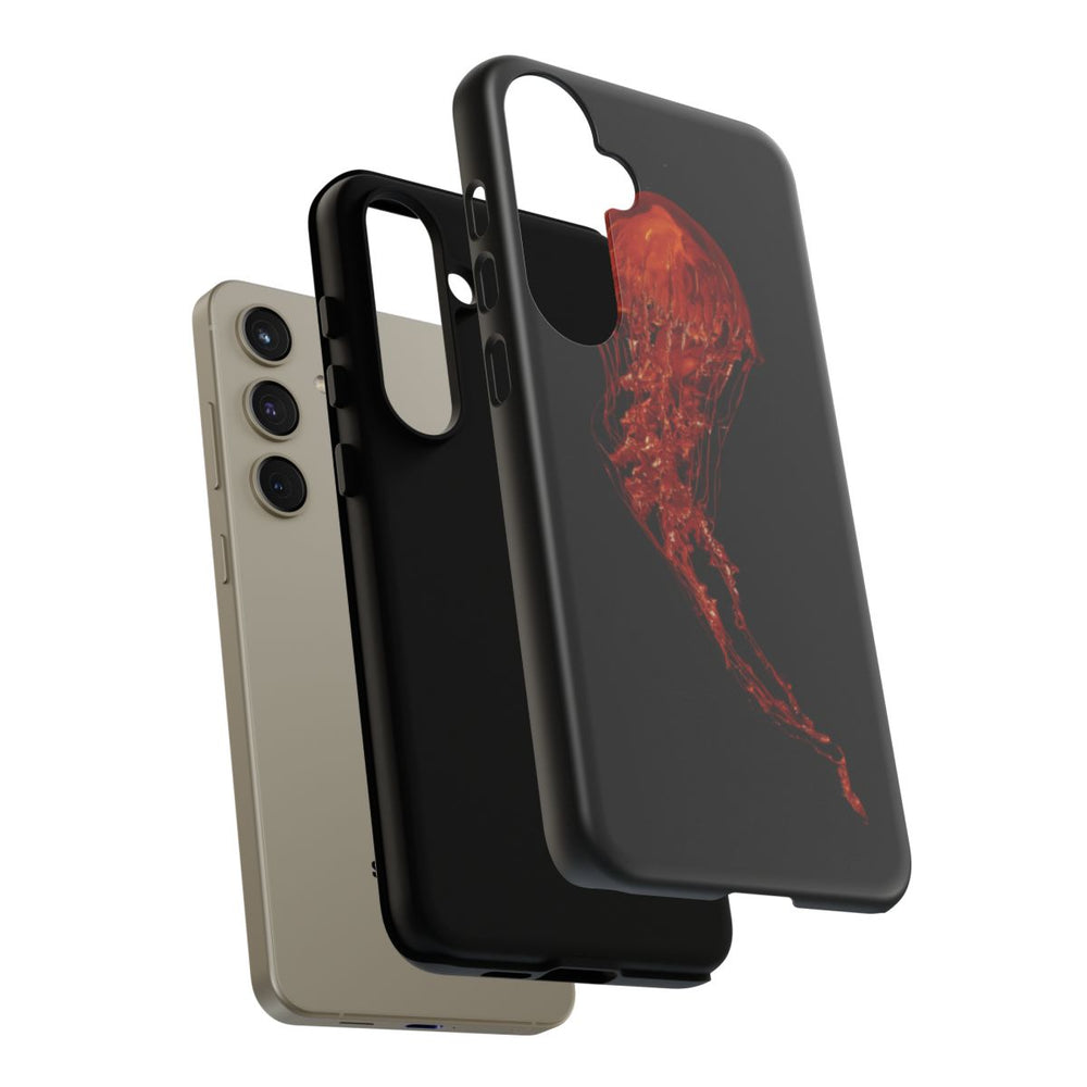 Dit ontwerp toont een gedetailleerde rode kwal met sierlijk golvende tentakels op een effen zwarte achtergrond. De kwal staat centraal en heeft een glanzende, doorschijnende uitstraling die de organische vorm benadrukt. Het hoesje bestaat uit twee lagen van polycarbonaat en TPU met een matte afwerking, waardoor het extra stevig is en goed bestand tegen gebruik buitenshuis. Geschikt voor draadloos opladen.