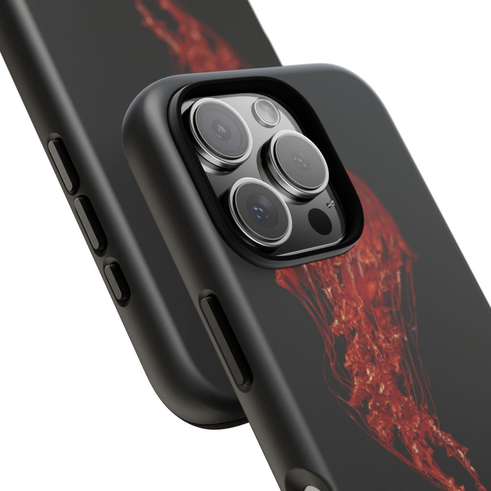 Dit hoesje heeft een opvallende afbeelding van een gedetailleerde rode kwal met sierlijke tentakels op een effen zwarte achtergrond. Het minimalistische ontwerp benadrukt de levendige rode kleur en de fijne structuur van de kwal. Het matte hoesje bestaat uit een stevige polycarbonaat buitenkant en een TPU binnenlaag, wat zorgt voor dubbele bescherming en ondersteuning van draadloos opladen. Het hoesje is duurzaam en bestand tegen gebruik buitenshuis.