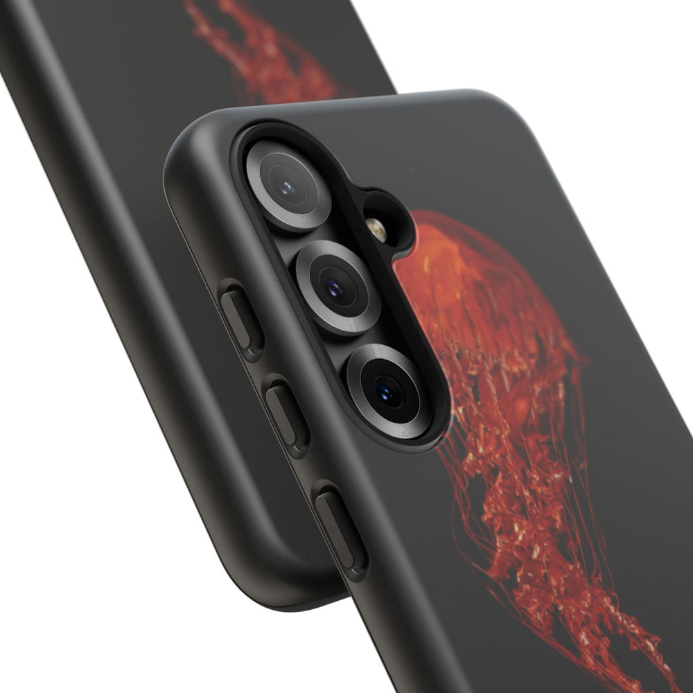 Dit hoesje heeft een opvallende rode kwal centraal op een effen zwarte achtergrond. De kwal heeft een ronde koepel en lange, sierlijke tentakels die naar beneden hangen. Het ontwerp is helder en minimalistisch, waarbij de levendige rode kleur en de fijne details van de kwal extra opvallen. Het hoesje bestaat uit twee lagen van polycarbonaat en TPU en is stevig, duurzaam en geschikt voor draadloos opladen.