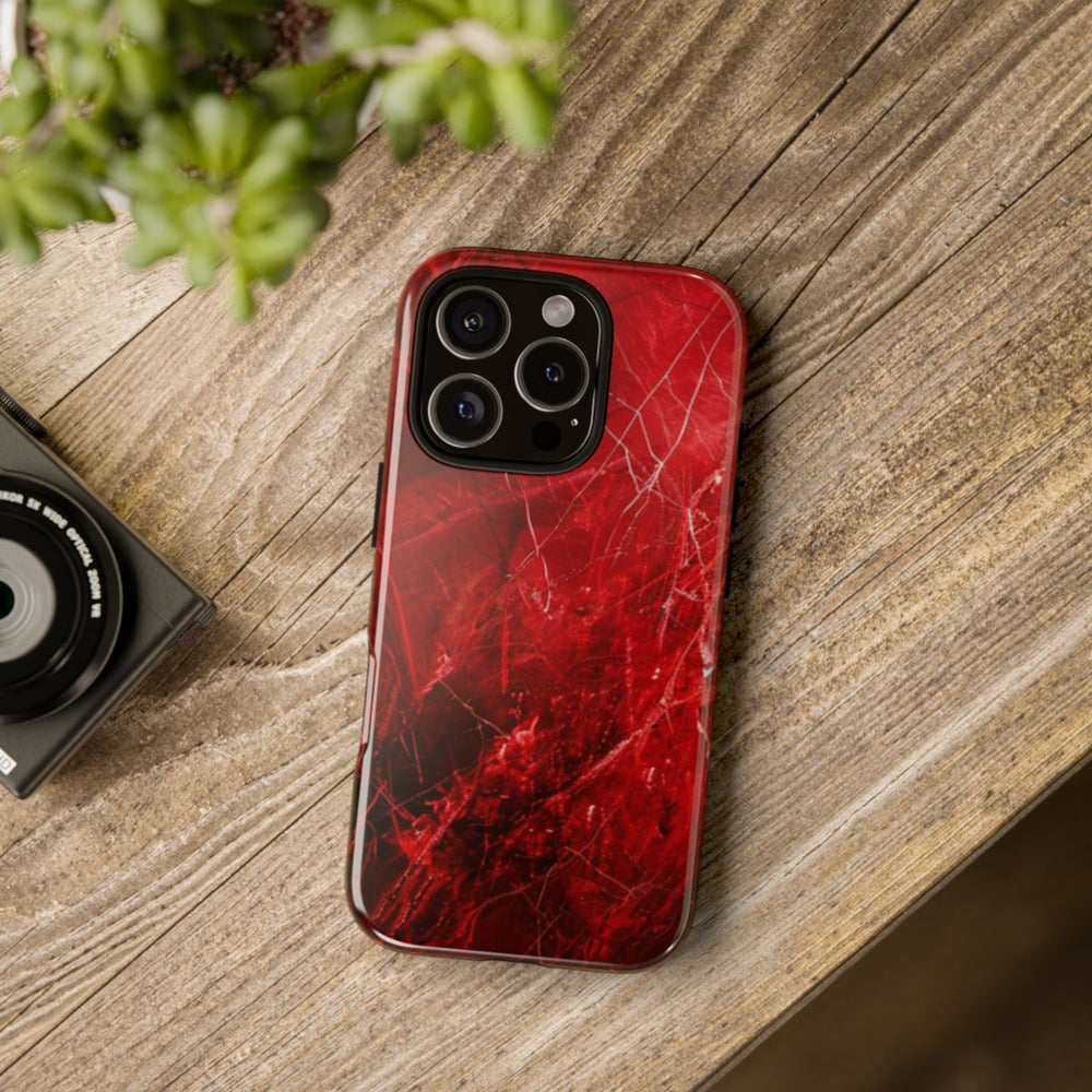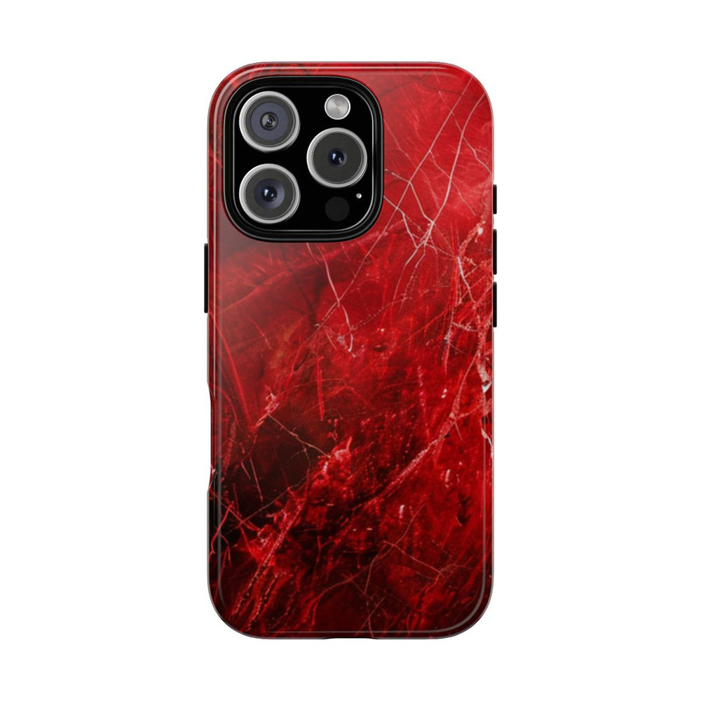 Dit hoesje heeft een opvallende rode marmerstructuur met fijne, doorlopende nerven. Het patroon bestaat uit verschillende roodtinten met subtiele accenten en donkere delen, wat zorgt voor een dynamische en elegante uitstraling die doet denken aan natuursteen. Het glanzende, stevige hoesje is opgebouwd uit twee lagen: een polycarbonaat buitenkant en een TPU-binnenzijde voor extra stevigheid en bescherming. Het hoesje ondersteunt draadloos opladen en is bestand tegen weersinvloeden, waardoor het zijn mooie uitstraling langdurig behoudt.