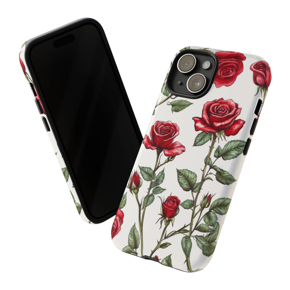 Dit hoesje is bedrukt met een gedetailleerd patroon van rode rozen, groene bladeren en stelen op een witte achtergrond. De rozen zijn getekend in een handgemaakte, wetenschappelijke stijl en tonen verschillende stadia van bloei, van knop tot volledig geopende bloem. Het patroon herhaalt zich over het hele oppervlak, wat zorgt voor een klassieke, bloemrijke uitstraling. Het hoesje heeft een glanzende afwerking en is extra stevig dankzij de dubbele laag van polycarbonaat en TPU. Dit biedt optimale bescherming en duurzaamheid. Het hoesje ondersteunt draadloos opladen en is bestand tegen weersinvloeden.
