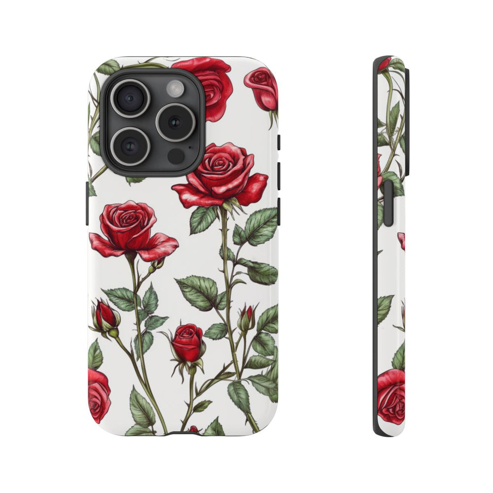 Dit hoesje is bedrukt met een gedetailleerd patroon van rode rozen, groene bladeren en stelen op een witte achtergrond. De rozen zijn getekend in een handgemaakte, wetenschappelijke stijl en tonen verschillende stadia van bloei, van knop tot volledig geopende bloem. Het patroon herhaalt zich over het hele oppervlak, wat zorgt voor een klassieke, bloemrijke uitstraling. Het hoesje heeft een glanzende afwerking en is extra stevig dankzij de dubbele laag van polycarbonaat en TPU. Dit biedt optimale bescherming en duurzaamheid. Het hoesje ondersteunt draadloos opladen en is bestand tegen weersinvloeden.