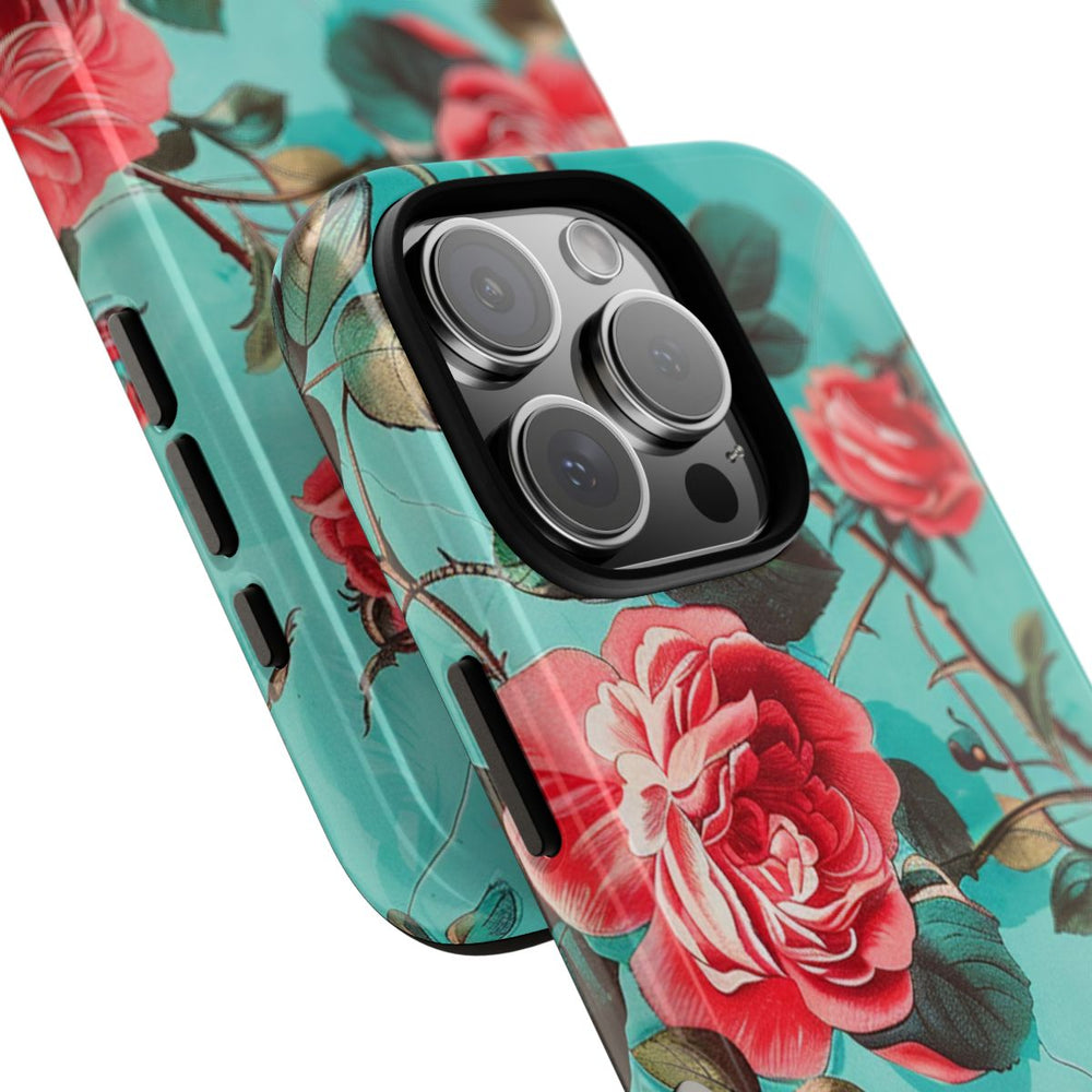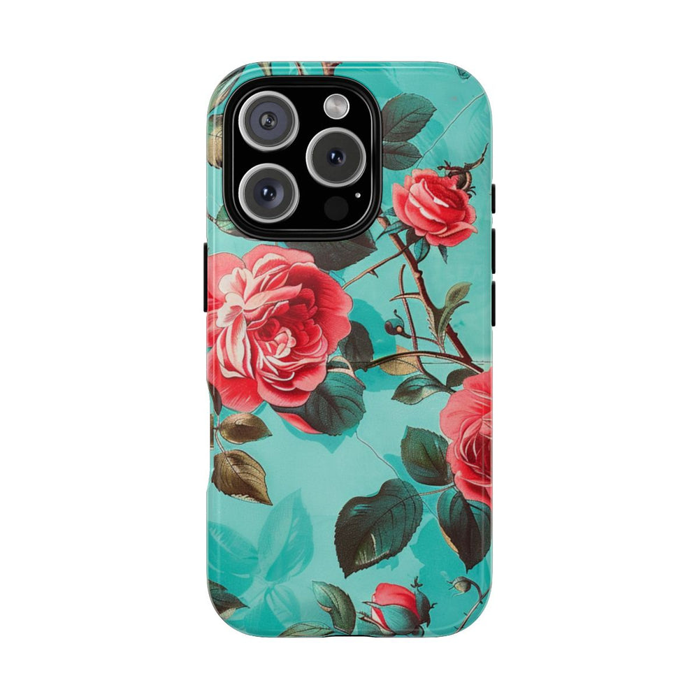 Dit hoesje heeft een patroon van levendige rode rozen met gedetailleerde groene bladeren en bruine stelen op een heldere turquoise achtergrond. De bloemen zijn op een natuurlijke, vloeiende manier over het hele oppervlak verdeeld. Het hoesje is glanzend en stevig dankzij de dubbele laag van een polycarbonaat buitenkant en een TPU-binnenkant, wat extra stevigheid en bescherming biedt. Ondersteunt draadloos opladen en is bestand tegen weersinvloeden, terwijl het zijn heldere uitstraling behoudt.