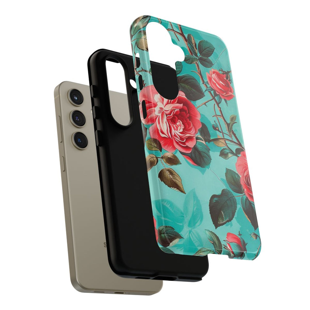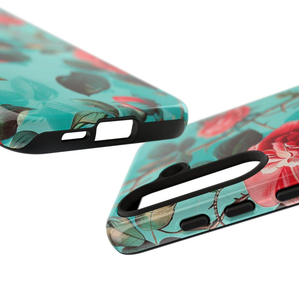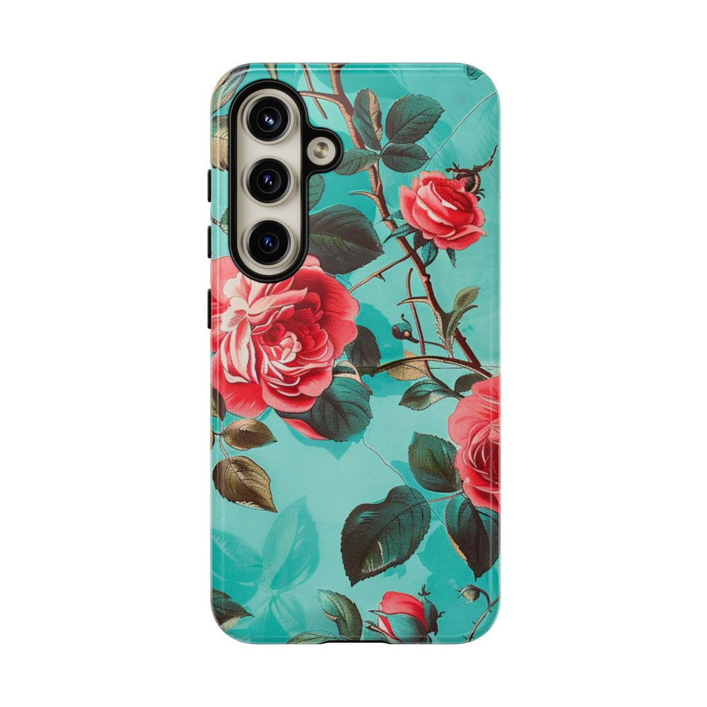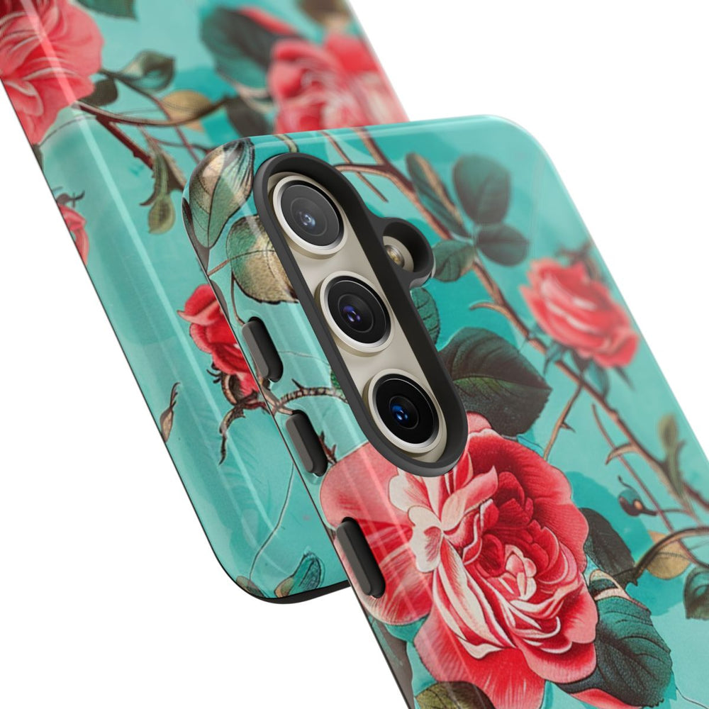 Dit hoesje heeft een patroon van levendige rode rozen met gedetailleerde groene bladeren en bruine stelen op een heldere turquoise achtergrond. De bloemen zijn op een natuurlijke, vloeiende manier over het hele oppervlak verdeeld. Het hoesje is glanzend en stevig dankzij de dubbele laag van een polycarbonaat buitenkant en een TPU-binnenkant, wat extra stevigheid en bescherming biedt. Ondersteunt draadloos opladen en is bestand tegen weersinvloeden, terwijl het zijn heldere uitstraling behoudt.