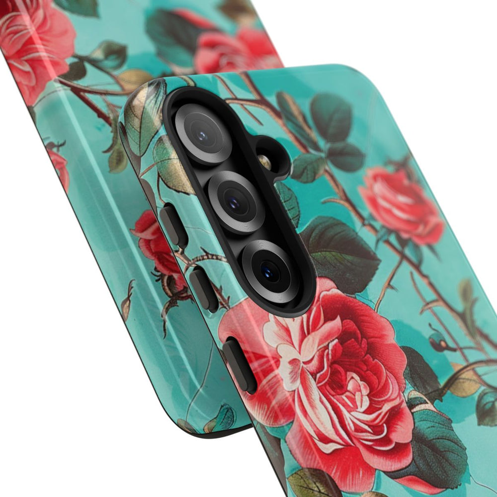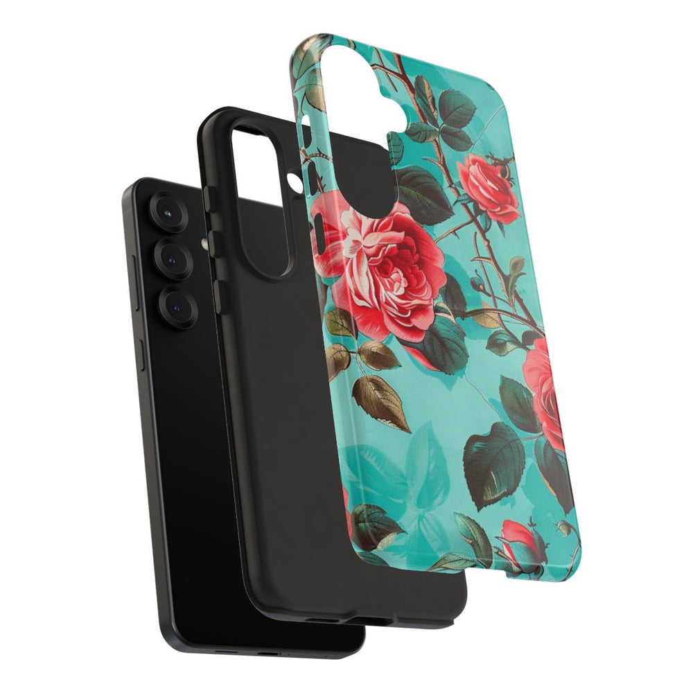 Dit hoesje heeft een patroon van levendige rode rozen met gedetailleerde groene bladeren en bruine stelen op een heldere turquoise achtergrond. De bloemen zijn op een natuurlijke, vloeiende manier over het hele oppervlak verdeeld. Het hoesje is glanzend en stevig dankzij de dubbele laag van een polycarbonaat buitenkant en een TPU-binnenkant, wat extra stevigheid en bescherming biedt. Ondersteunt draadloos opladen en is bestand tegen weersinvloeden, terwijl het zijn heldere uitstraling behoudt.
