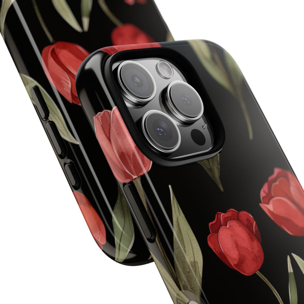 Dit hoesje is versierd met een doorlopend patroon van rode tulpen met groene bladeren op een effen zwarte achtergrond. De tulpen verschillen subtiel in vorm en kleur, wat zorgt voor een natuurlijke en sfeervolle uitstraling. Het patroon herhaalt zich gelijkmatig, waardoor het perfect is voor volledige bedekking van het hoesje. Dit glanzende en stevige hoesje bestaat uit twee lagen: een harde polycarbonaat buitenkant en een TPU-binnenzijde voor extra bescherming. Het hoesje ondersteunt draadloos opladen en is bestand tegen invloeden van buitenaf.