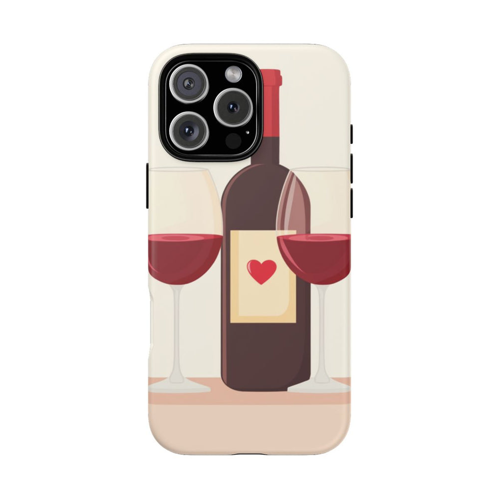 Dit ontwerp toont een gestileerde illustratie van een rode wijnfles met een rood hart op het etiket, geflankeerd door twee glazen die tot de helft gevuld zijn met rode wijn. De afbeelding heeft een strakke witte achtergrond en een lichtbeige tafelblad. Het hoesje bestaat uit twee lagen: een stevige polycarbonaat buitenkant en een TPU binnenlaag. Het ondersteunt draadloos opladen en is bestand tegen weersinvloeden.