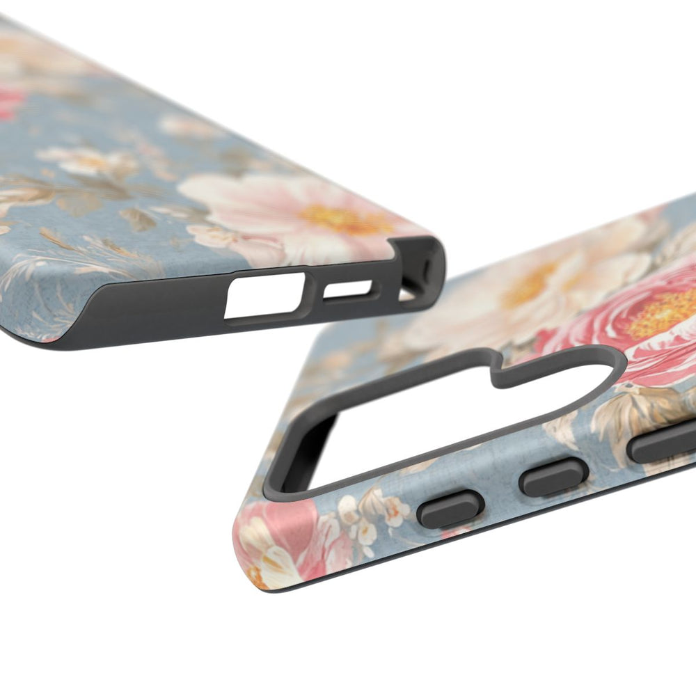 Dit hoesje heeft een romantisch bloemenpatroon met grote roze en witte bloemen op een zachte blauwe achtergrond. De bloemen zijn voorzien van gele harten en worden omringd door fijne beige en groene bladeren. Kleine witte bloesems en knopjes zorgen voor een verfijnde, vintage uitstraling. Het patroon bedekt het hele oppervlak van het hoesje en geeft het een elegante en tijdloze look. Het matte hoesje bestaat uit twee lagen van polycarbonaat en TPU, waardoor het extra stevig is en bestand tegen gebruik buitenshuis.