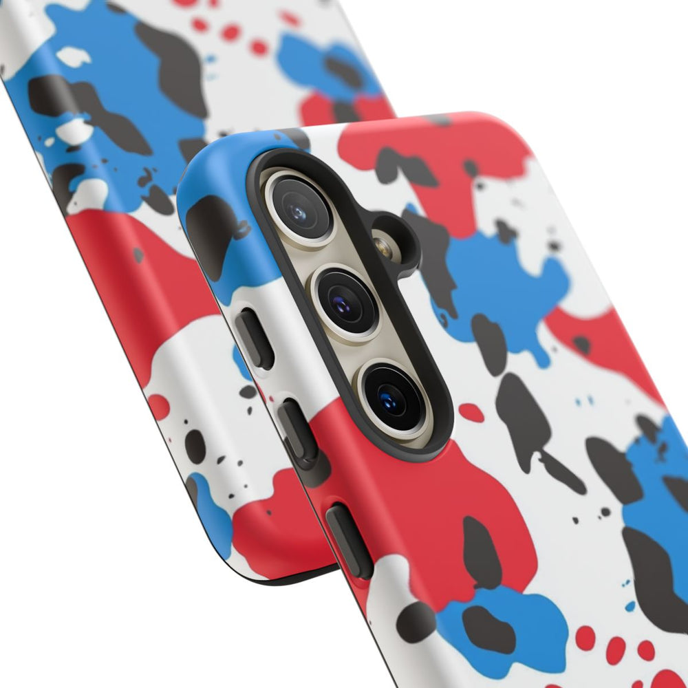 Dit telefoonhoesje heeft een opvallend abstract patroon met grote rode en blauwe vlekken en kleinere zwarte stippen op een witte achtergrond. Het kleurrijke ontwerp zorgt voor een moderne en levendige uitstraling. Het hoesje bestaat uit twee lagen: een stevige polycarbonaat buitenkant en een TPU-binnenzijde voor extra bescherming en duurzaamheid. Geschikt voor draadloos opladen.