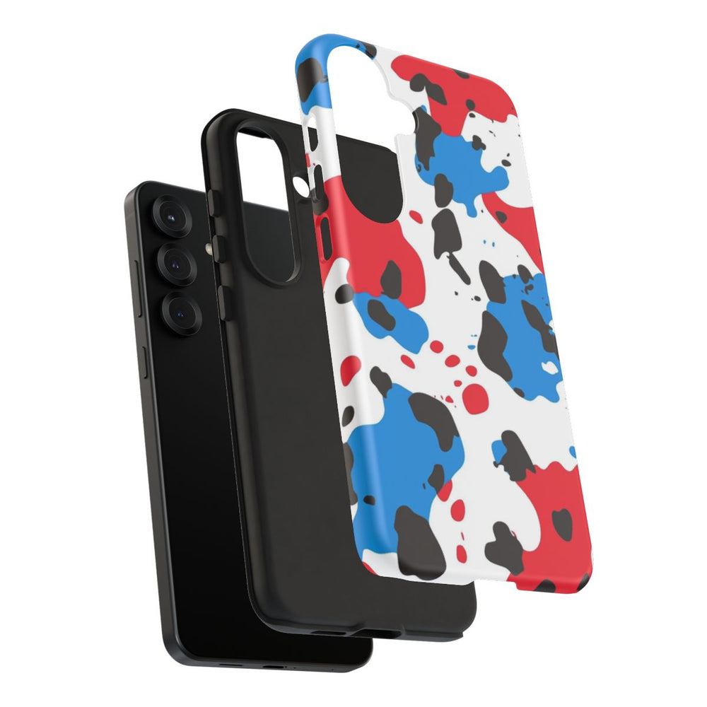 Dit telefoonhoesje is voorzien van een abstract patroon met grote rode en blauwe vlekken, afgewisseld met kleinere zwarte stippen op een witte achtergrond. Het opvallende kleurcontrast zorgt voor een levendige en dynamische uitstraling. Het hoesje bestaat uit twee lagen van polycarbonaat en TPU, waardoor het extra stevig en beschermend is. Ondersteunt draadloos opladen en is bestand tegen invloeden van buitenaf.