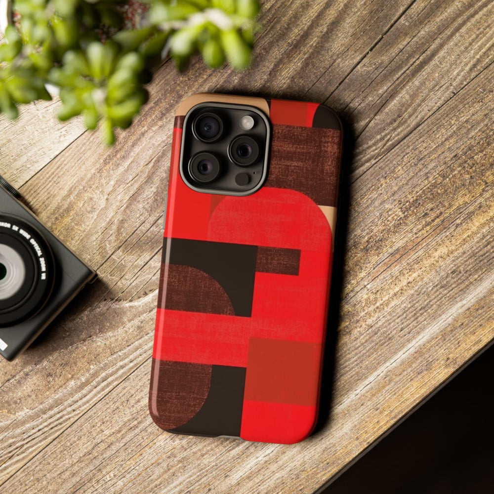 Dit telefoonhoesje heeft een modern en artistiek ontwerp met een geometrisch abstract patroon in opvallende rood-, bruin- en beige tinten. De vormen bestaan uit rechthoeken, vierkanten en afgeronde hoeken, die samen een rasterachtig geheel vormen. De licht verweerde, korrelige textuur geeft het ontwerp extra diepte en karakter. Het hoesje is glanzend en stevig, met een buitenkant van polycarbonaat en een binnenzijde van TPU, waardoor je telefoon optimaal beschermd is. Geschikt voor draadloos opladen.