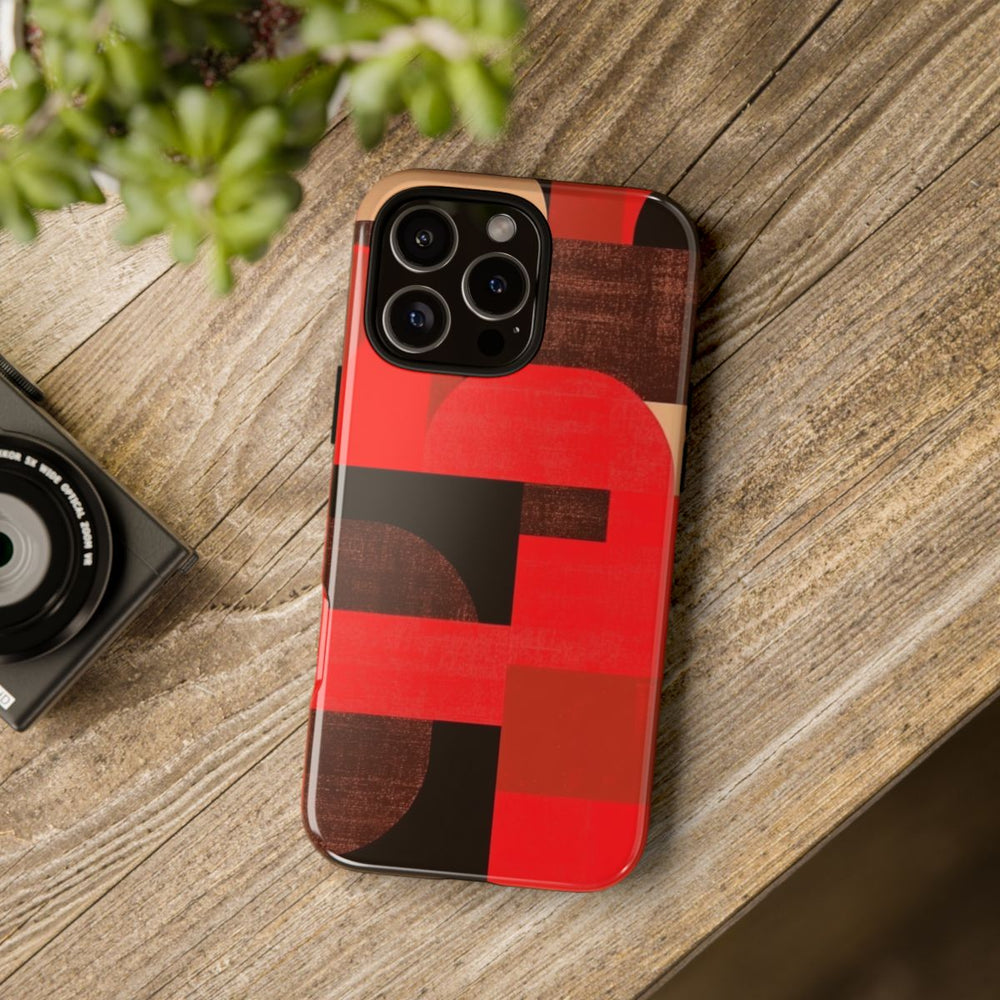 Dit telefoonhoesje heeft een modern en artistiek ontwerp met een geometrisch abstract patroon in opvallende rood-, bruin- en beige tinten. De vormen bestaan uit rechthoeken, vierkanten en afgeronde hoeken, die samen een rasterachtig geheel vormen. De licht verweerde, korrelige textuur geeft het ontwerp extra diepte en karakter. Het hoesje is glanzend en stevig, met een buitenkant van polycarbonaat en een binnenzijde van TPU, waardoor je telefoon optimaal beschermd is. Geschikt voor draadloos opladen.