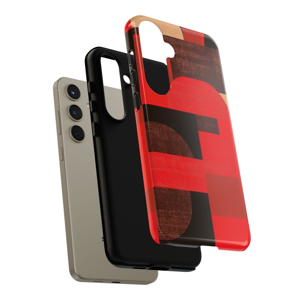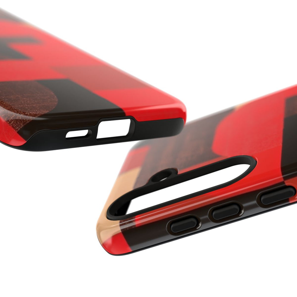 Dit telefoonhoesje heeft een modern en artistiek ontwerp met een geometrisch abstract patroon in opvallende rood-, bruin- en beige tinten. De vormen bestaan uit rechthoeken, vierkanten en afgeronde hoeken, die samen een rasterachtig geheel vormen. De licht verweerde, korrelige textuur geeft het ontwerp extra diepte en karakter. Het hoesje is glanzend en stevig, met een buitenkant van polycarbonaat en een binnenzijde van TPU, waardoor je telefoon optimaal beschermd is. Geschikt voor draadloos opladen.