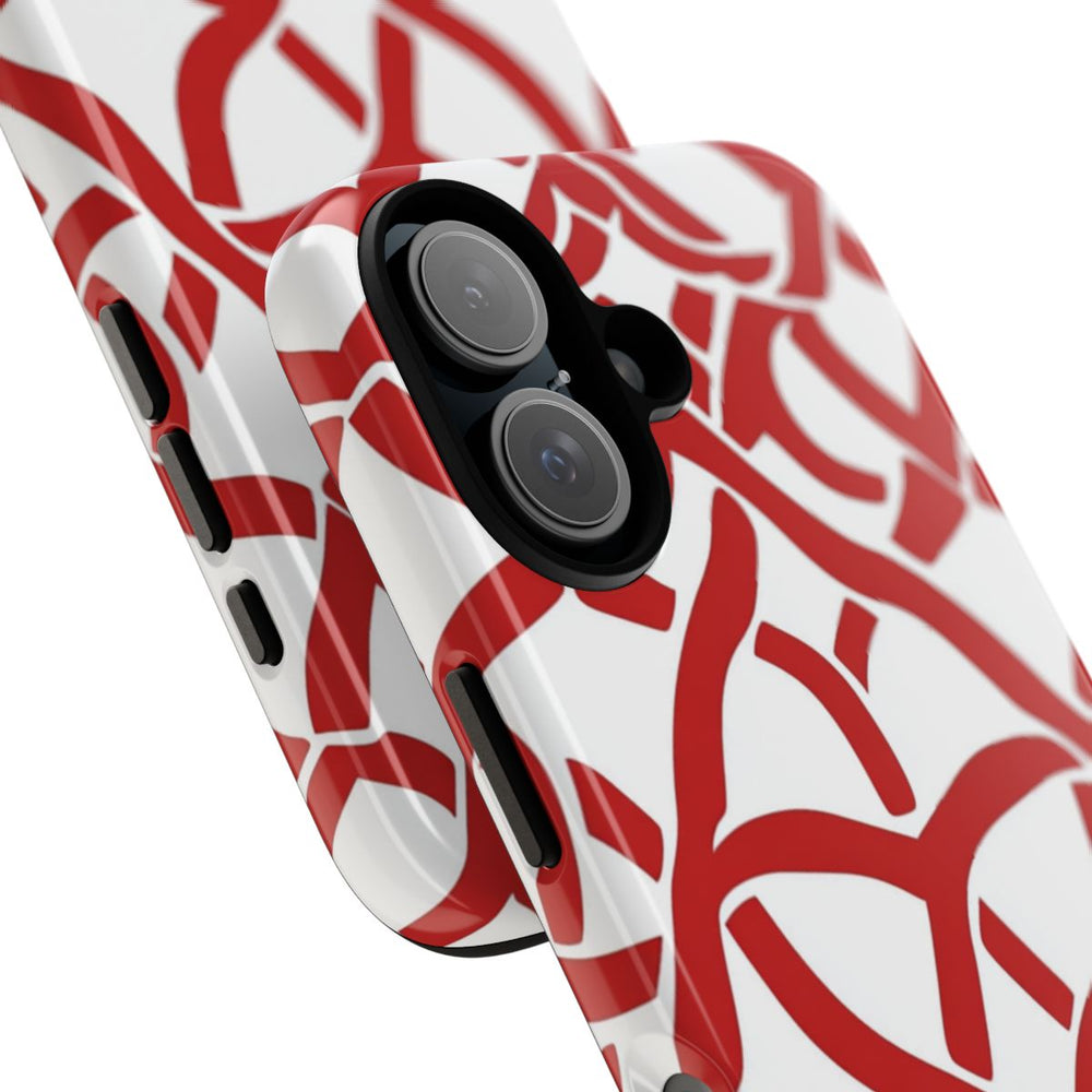 Dit telefoonhoesje is voorzien van een rood Keltisch knoopmotief op een witte achtergrond. Het patroon bestaat uit sierlijk verweven lijnen die samenkomen in de kenmerkende lussen en vormen van Keltische kunst. Het ontwerp loopt naadloos door en is geschikt voor een herhalend effect. Het hoesje heeft een glanzende afwerking en bestaat uit een stevige polycarbonaat buitenkant met een TPU-binnenzijde, waardoor je toestel optimaal beschermd is. Dankzij de dubbele laag is het hoesje extra duurzaam en bestand tegen invloeden van buitenaf. Ondersteunt draadloos opladen.