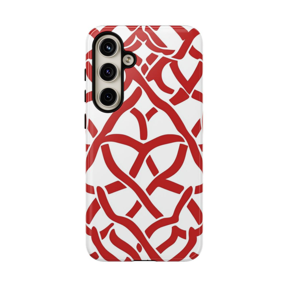 Dit telefoonhoesje is voorzien van een rood Keltisch knoopmotief op een witte achtergrond. Het patroon bestaat uit sierlijk verweven lijnen die samenkomen in de kenmerkende lussen en vormen van Keltische kunst. Het ontwerp loopt naadloos door en is geschikt voor een herhalend effect. Het hoesje heeft een glanzende afwerking en bestaat uit een stevige polycarbonaat buitenkant met een TPU-binnenzijde, waardoor je toestel optimaal beschermd is. Dankzij de dubbele laag is het hoesje extra duurzaam en bestand tegen invloeden van buitenaf. Ondersteunt draadloos opladen.