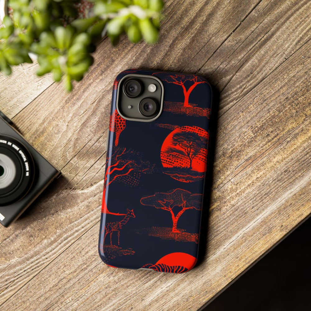 Dit hoesje heeft een opvallend patroon van Afrikaanse dieren en bomen in felrood neon op een donkerblauwe achtergrond. Het ontwerp toont giraffen, zebra's, olifanten en diverse gestileerde bomen, wat zorgt voor een levendige en dynamische uitstraling. Het hoesje bestaat uit twee lagen: een glanzende buitenkant van polycarbonaat en een TPU-binnenzijde voor extra stevigheid en bescherming. Het ondersteunt draadloos opladen, is bestand tegen weersinvloeden en blijft optisch helder.