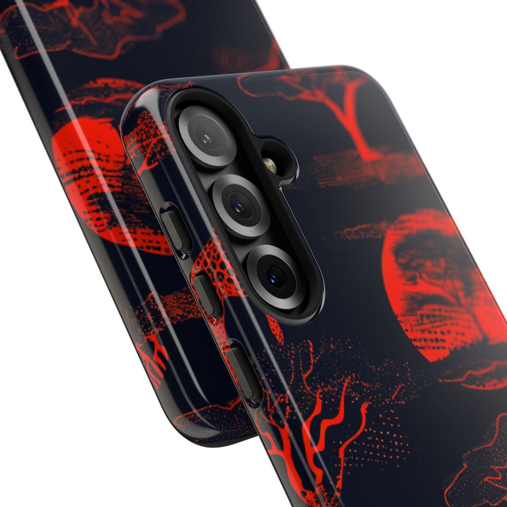 Dit hoesje heeft een opvallend patroon van Afrikaanse dieren en bomen in felrood neon op een donkerblauwe achtergrond. Het ontwerp toont giraffen, zebra's, olifanten en diverse gestileerde bomen, wat zorgt voor een levendige en dynamische uitstraling. Het hoesje bestaat uit twee lagen: een glanzende buitenkant van polycarbonaat en een TPU-binnenzijde voor extra stevigheid en bescherming. Het ondersteunt draadloos opladen, is bestand tegen weersinvloeden en blijft optisch helder.