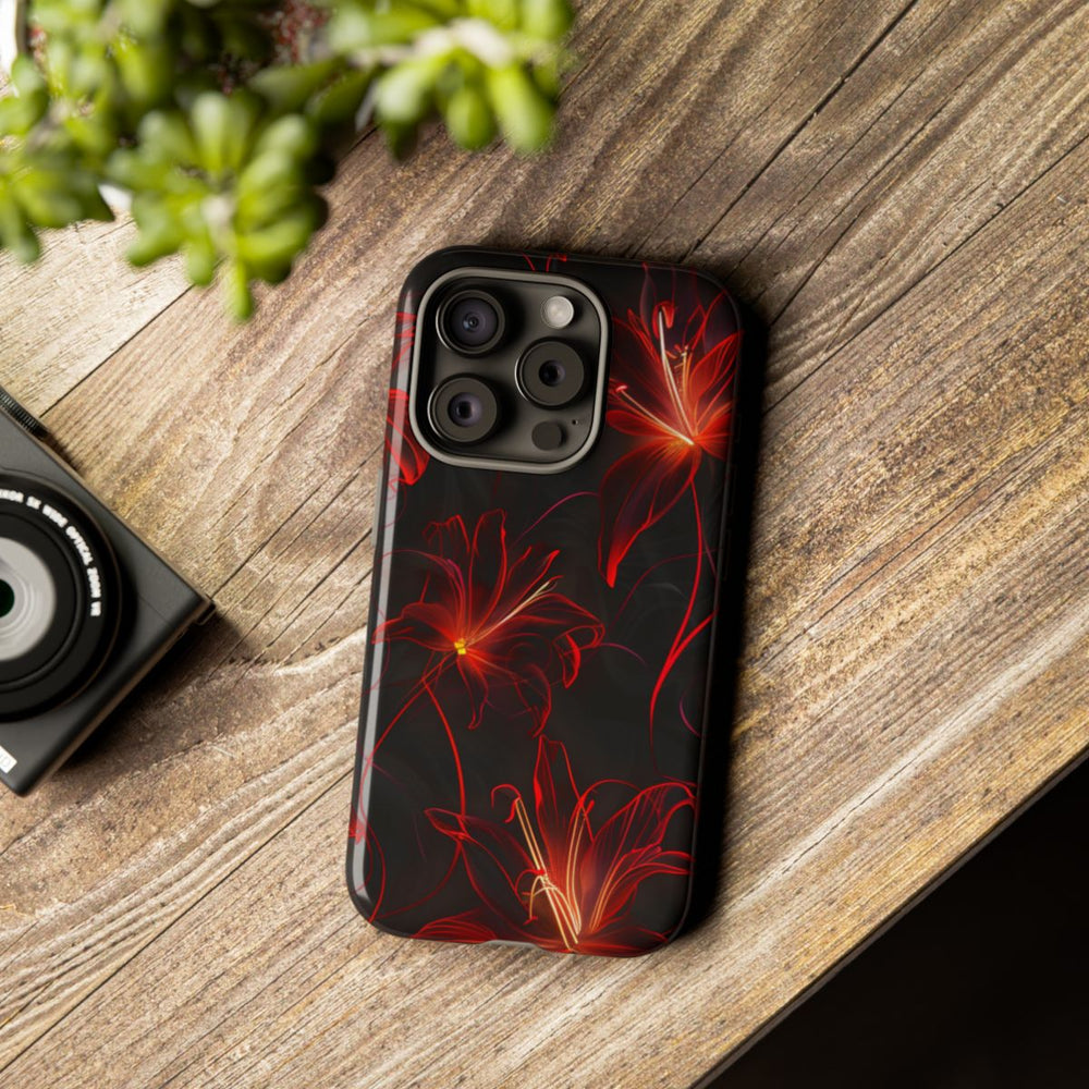 Dit hoesje heeft een naadloos patroon van rode neon spinlelies op een diepzwarte achtergrond. De bloemen zijn verfijnd getekend met lichtgevende rode en oranje contouren, wat zorgt voor een levendig en dynamisch effect. Het patroon herhaalt zich vloeiend, waardoor het perfect is voor een volledige bedekking van het hoesje. Het glanzende, stevige hoesje bestaat uit een dubbele laag met een polycarbonaat buitenkant en een TPU binnenzijde, wat extra stevigheid en bescherming biedt. Het hoesje ondersteunt draadloos opladen, is bestand tegen invloeden van buitenaf en behoudt langdurig zijn heldere uitstraling.