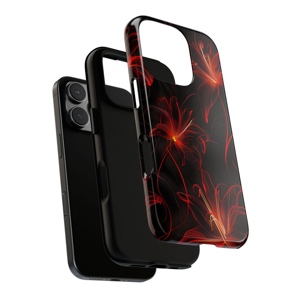 Dit hoesje heeft een naadloos patroon van rode neon spinlelies op een diepzwarte achtergrond. De bloemen zijn verfijnd getekend met lichtgevende rode en oranje contouren, wat zorgt voor een levendig en dynamisch effect. Het patroon herhaalt zich vloeiend, waardoor het perfect is voor een volledige bedekking van het hoesje. Het glanzende, stevige hoesje bestaat uit een dubbele laag met een polycarbonaat buitenkant en een TPU binnenzijde, wat extra stevigheid en bescherming biedt. Het hoesje ondersteunt draadloos opladen, is bestand tegen invloeden van buitenaf en behoudt langdurig zijn heldere uitstraling.