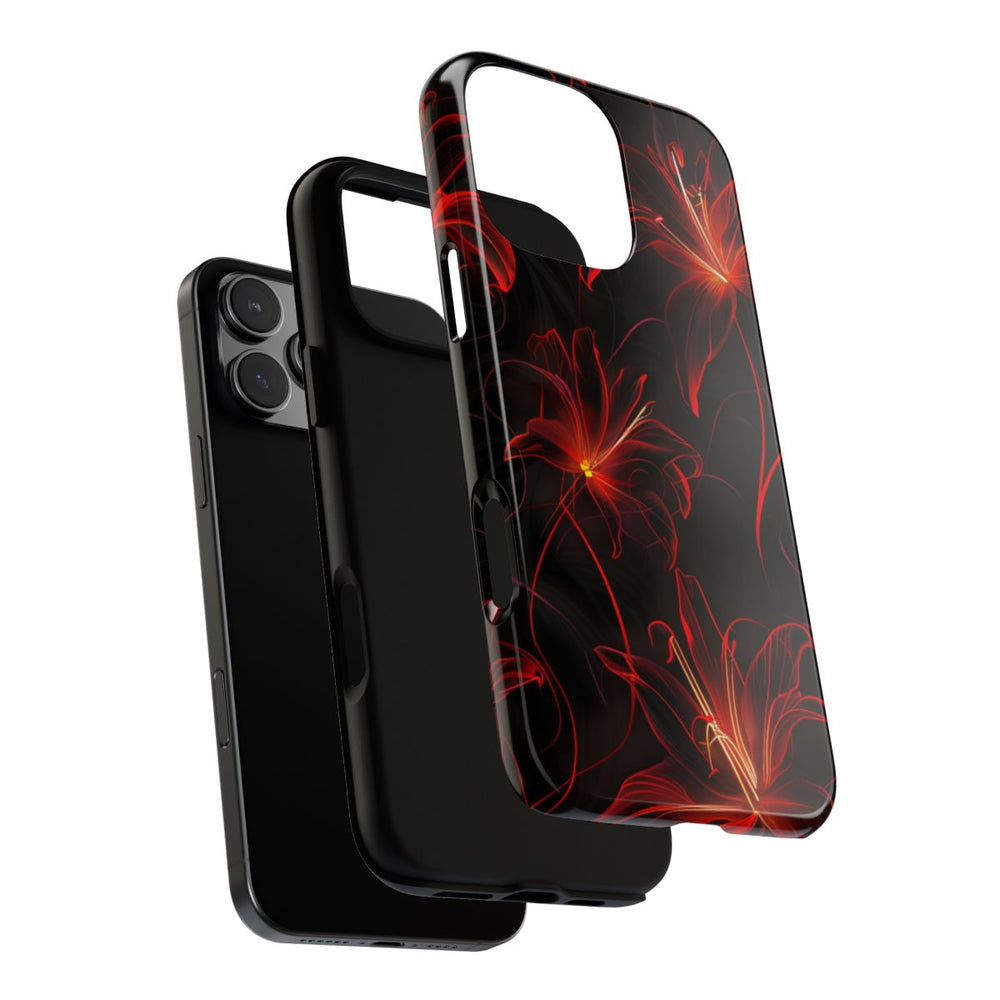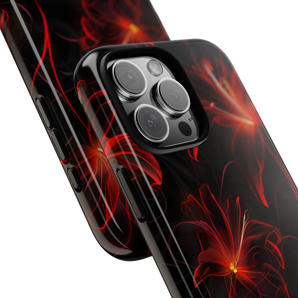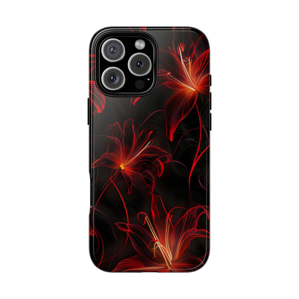 Dit hoesje heeft een naadloos patroon van rode neon spinlelies op een diepzwarte achtergrond. De bloemen zijn verfijnd getekend met lichtgevende rode en oranje contouren, wat zorgt voor een levendig en dynamisch effect. Het patroon herhaalt zich vloeiend, waardoor het perfect is voor een volledige bedekking van het hoesje. Het glanzende, stevige hoesje bestaat uit een dubbele laag met een polycarbonaat buitenkant en een TPU binnenzijde, wat extra stevigheid en bescherming biedt. Het hoesje ondersteunt draadloos opladen, is bestand tegen invloeden van buitenaf en behoudt langdurig zijn heldere uitstraling.