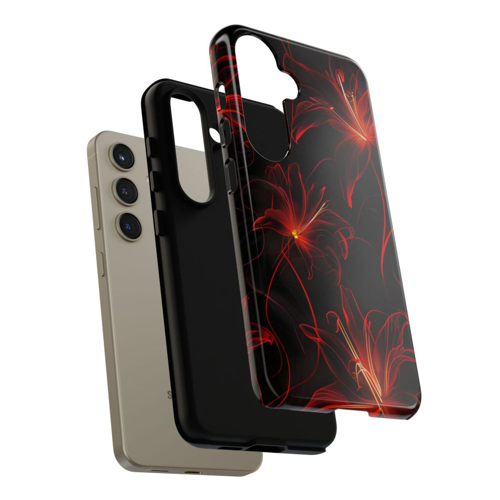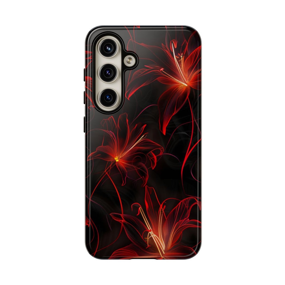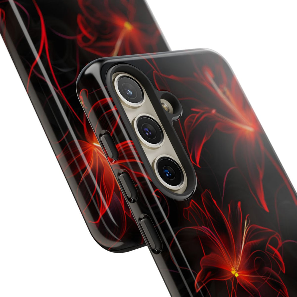 Dit hoesje heeft een naadloos patroon van rode neon spinlelies op een diepzwarte achtergrond. De bloemen zijn verfijnd getekend met lichtgevende rode en oranje contouren, wat zorgt voor een levendig en dynamisch effect. Het patroon herhaalt zich vloeiend, waardoor het perfect is voor een volledige bedekking van het hoesje. Het glanzende, stevige hoesje bestaat uit een dubbele laag met een polycarbonaat buitenkant en een TPU binnenzijde, wat extra stevigheid en bescherming biedt. Het hoesje ondersteunt draadloos opladen, is bestand tegen invloeden van buitenaf en behoudt langdurig zijn heldere uitstraling.