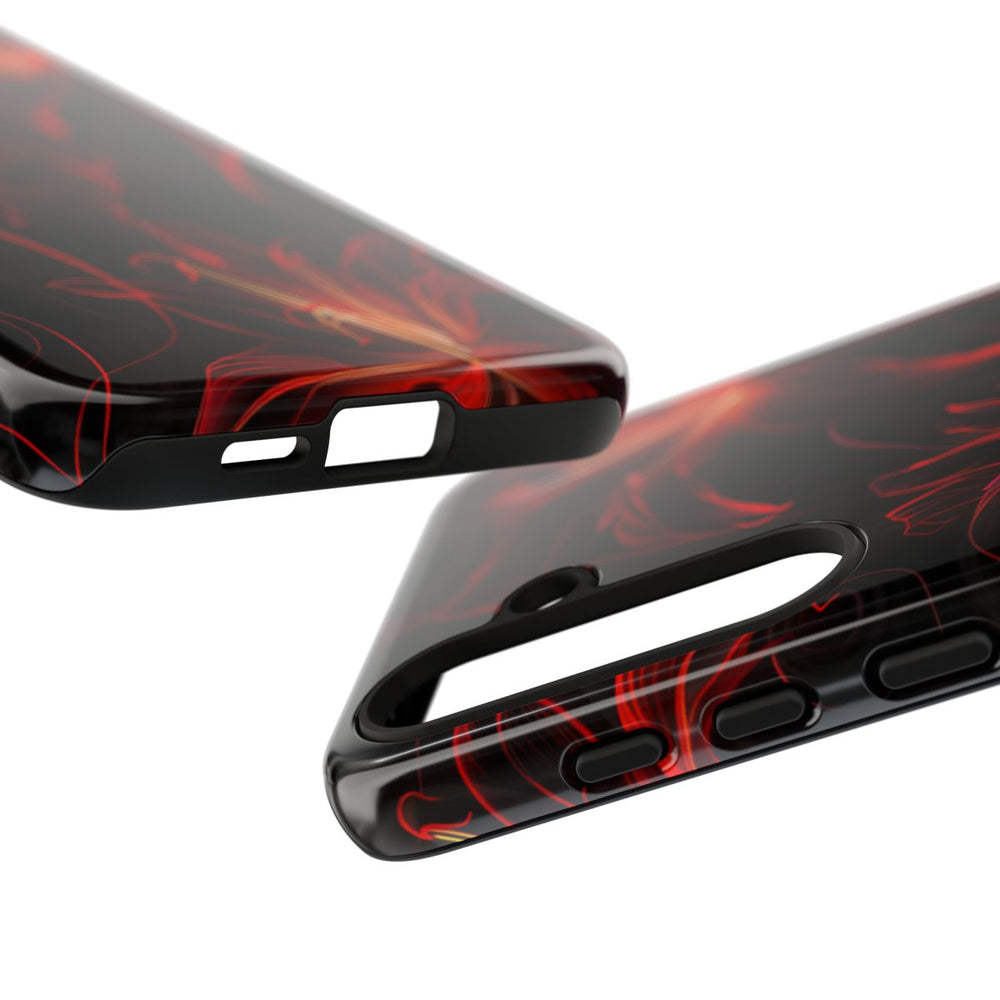 Dit hoesje heeft een naadloos patroon van rode neon spinlelies op een diepzwarte achtergrond. De bloemen zijn verfijnd getekend met lichtgevende rode en oranje contouren, wat zorgt voor een levendig en dynamisch effect. Het patroon herhaalt zich vloeiend, waardoor het perfect is voor een volledige bedekking van het hoesje. Het glanzende, stevige hoesje bestaat uit een dubbele laag met een polycarbonaat buitenkant en een TPU binnenzijde, wat extra stevigheid en bescherming biedt. Het hoesje ondersteunt draadloos opladen, is bestand tegen invloeden van buitenaf en behoudt langdurig zijn heldere uitstraling.