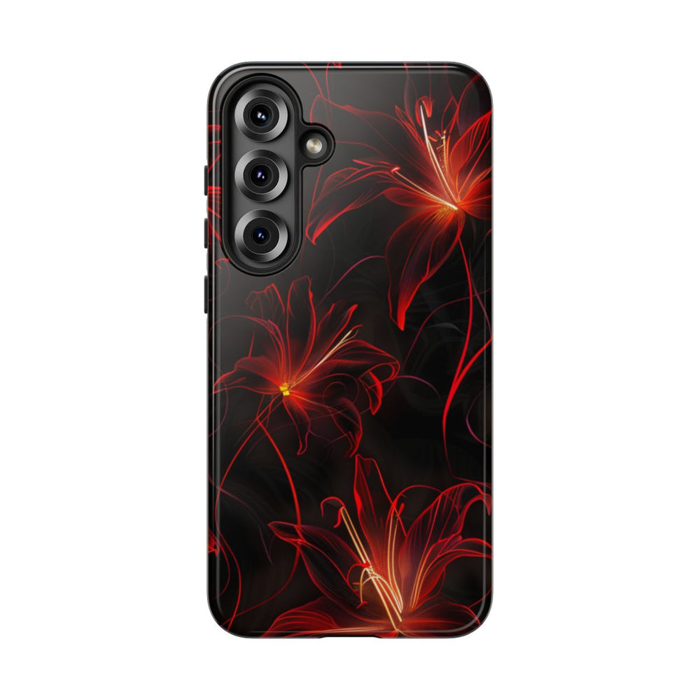 Dit hoesje heeft een naadloos patroon van rode neon spinlelies op een diepzwarte achtergrond. De bloemen zijn verfijnd getekend met lichtgevende rode en oranje contouren, wat zorgt voor een levendig en dynamisch effect. Het patroon herhaalt zich vloeiend, waardoor het perfect is voor een volledige bedekking van het hoesje. Het glanzende, stevige hoesje bestaat uit een dubbele laag met een polycarbonaat buitenkant en een TPU binnenzijde, wat extra stevigheid en bescherming biedt. Het hoesje ondersteunt draadloos opladen, is bestand tegen invloeden van buitenaf en behoudt langdurig zijn heldere uitstraling.