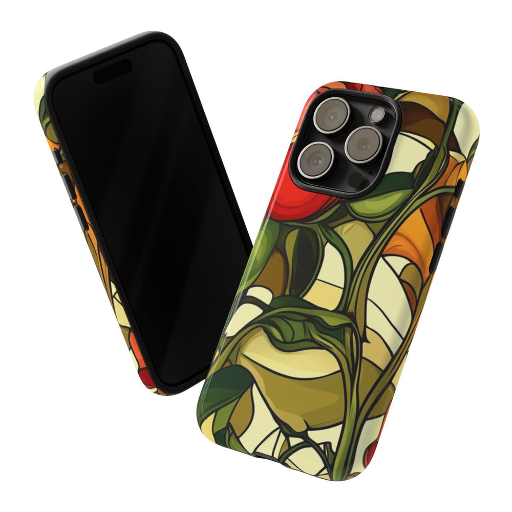 Dit hoesje is bedrukt met een sierlijk art nouveau ontwerp van gestileerde rode en oranje bloemen met weelderige groene bladeren. De bloemen hebben gelaagde bloemblaadjes met vloeiende lijnen en subtiele schaduwen, wat zorgt voor een glas-in-lood effect. De zachte crèmekleurige achtergrond laat de levendige kleuren van de bloemen en bladeren extra opvallen. Het hoesje is gemaakt van polycarbonaat en TPU, heeft een glanzende afwerking en biedt stevige bescherming dankzij de dubbele laag. Geschikt voor draadloos opladen.