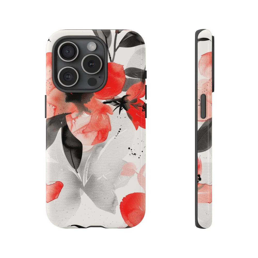 Dit hoesje heeft een herhalend patroon van exotische bloemen en bladeren, geschilderd in een waterverfstijl. De bloemen zijn overwegend rood met zwarte accenten en de bladeren zijn uitgevoerd in zwarte en grijze tinten. Door de lichte achtergrond komen de levendige rode bloemen extra goed naar voren. Het patroon oogt artistiek en vloeiend, met subtiele spetters en kleurverlopen voor een zachte, natuurlijke uitstraling. Het ontwerp is gedrukt op een glanzend en stevig hoesje van polycarbonaat en TPU, dat zorgt voor duurzaamheid, bescherming en ondersteuning van draadloos opladen.