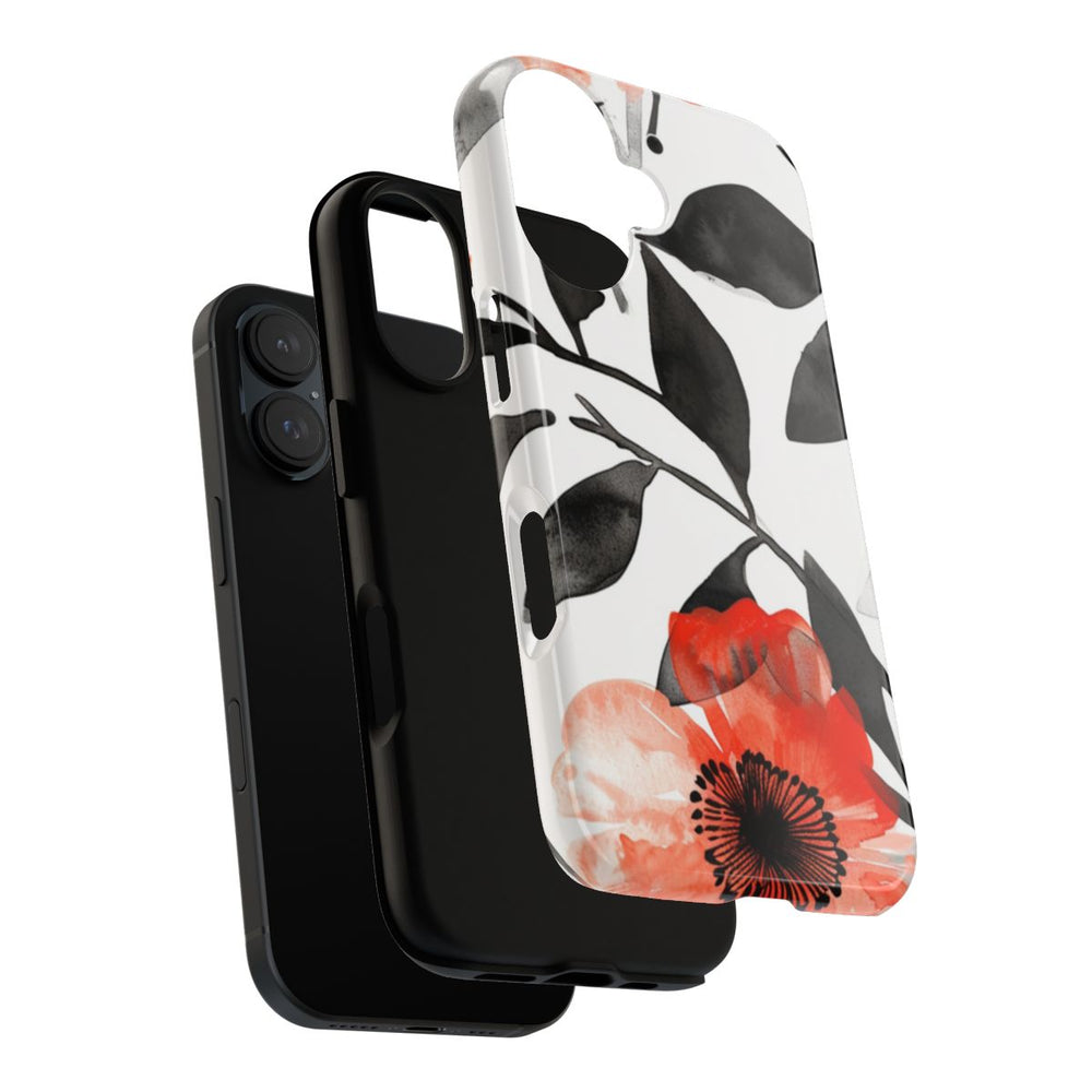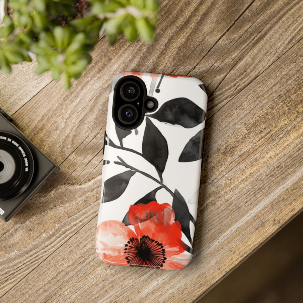 Dit hoesje heeft een herhalend patroon van grote rode bloemen in waterverf met verfijnde zwarte harten. Rondom de bloemen zijn zwarte en grijze bladeren en takjes te zien, wat zorgt voor een opvallend contrast op de witte achtergrond. Het ontwerp heeft een zachte, handgeschilderde uitstraling met zichtbare penseelstreken en kleurverlopen. Het hoesje is glanzend en extra stevig dankzij een dubbele laag van een polycarbonaat buitenkant en een TPU binnenzijde. Dit biedt optimale bescherming en duurzaamheid. Geschikt voor draadloos opladen. Niet geschikt voor MagSafe.