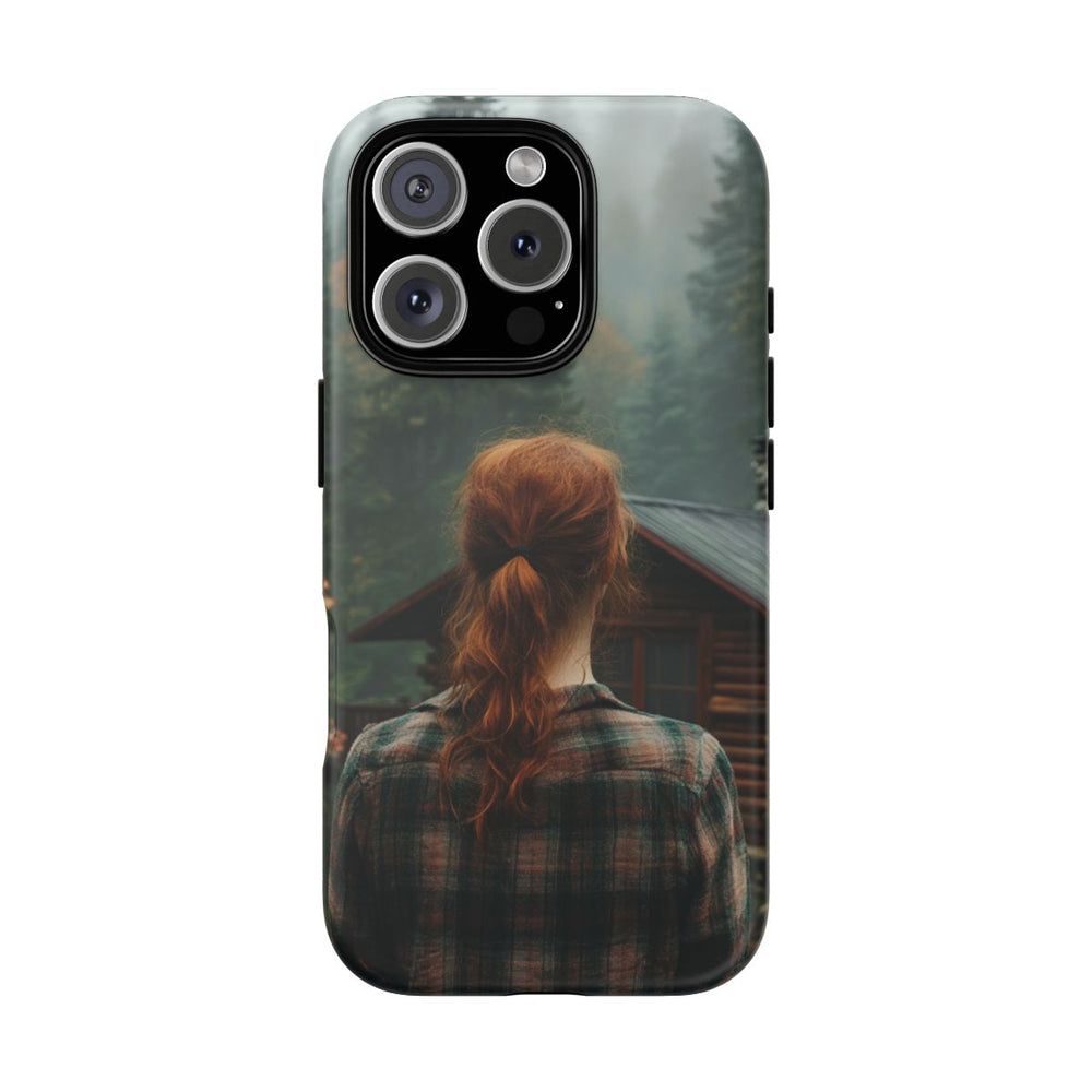 Op het hoesje staat een afbeelding van een vrouw met rood haar in een staart, gekleed in een groen-bruin geruit flanellen overhemd. Ze staat op een houten veranda met op de achtergrond een blokhut met stenen schoorsteen, omringd door hoge dennenbomen. De mistige en nevelige sfeer zorgt voor een mysterieuze uitstraling met gedempte herfstkleuren. Dit ontwerp is bedrukt op een matte, stevige hoes met dubbele laag en is geschikt voor draadloos opladen.