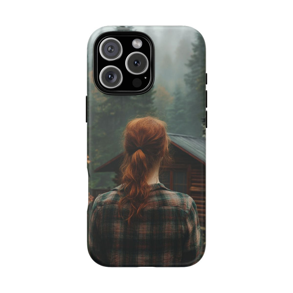 Deze afbeelding toont een vrouw met rood haar in een staart, gekleed in een geruit flanellen overhemd, staand op een houten veranda. Op de achtergrond staat een rustieke houten blokhut met een stenen schoorsteen, omringd door hoge dennenbomen in een mistig bos. De sfeer is herfstachtig en sfeervol, met zacht, diffuus licht. Dit stevige telefoonhoesje heeft een dubbele laag van polycarbonaat en TPU en is geschikt voor draadloos opladen.