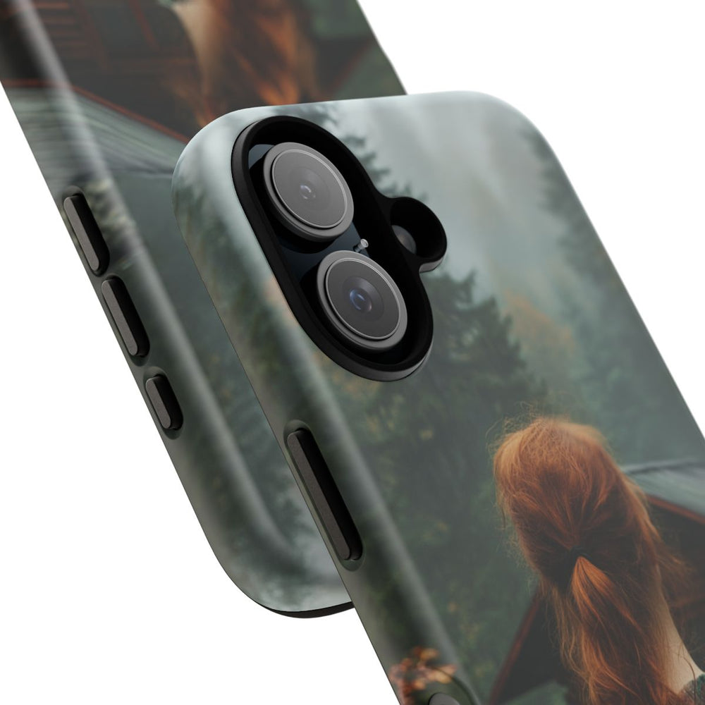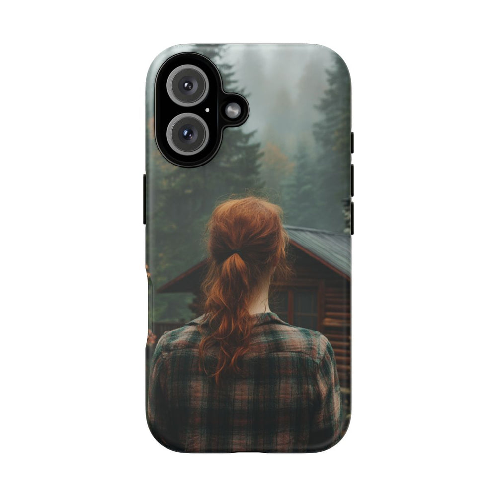 Op dit hoesje staat een vrouw met rood haar dat naar achteren is gebonden, gekleed in een groen-bruin geruit overhemd. Ze staat op een houten veranda, met op de achtergrond een rustieke blokhut met een stenen schoorsteen. Hoge dennenbomen omringen de hut en een nevelige sfeer zorgt voor een mysterieuze, mistige bosomgeving. Het hoesje heeft een dubbele laag met een polycarbonaat buitenkant en een TPU binnenzijde, en is geschikt voor draadloos opladen.