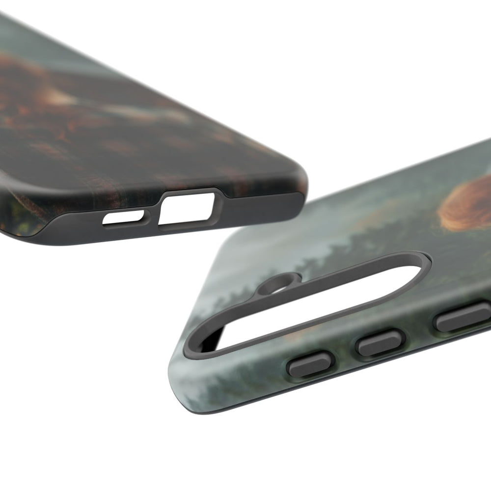 Op dit hoesje staat een vrouw met rood haar, samengebonden in een staart, gekleed in een groen-bruin geruit flanellen overhemd. Ze staat met haar rug naar de camera op een houten veranda en kijkt uit op een rustieke houten blokhut met een stenen schoorsteen. Op de achtergrond zijn hoge dennenbomen te zien in een mistig bos, met herfstbladeren die voor subtiele kleuraccenten zorgen. Het hoesje bestaat uit twee lagen met een matte afwerking en is gemaakt van polycarbonaat en TPU. Het is stevig, biedt optimale bescherming en ondersteunt draadloos opladen.
