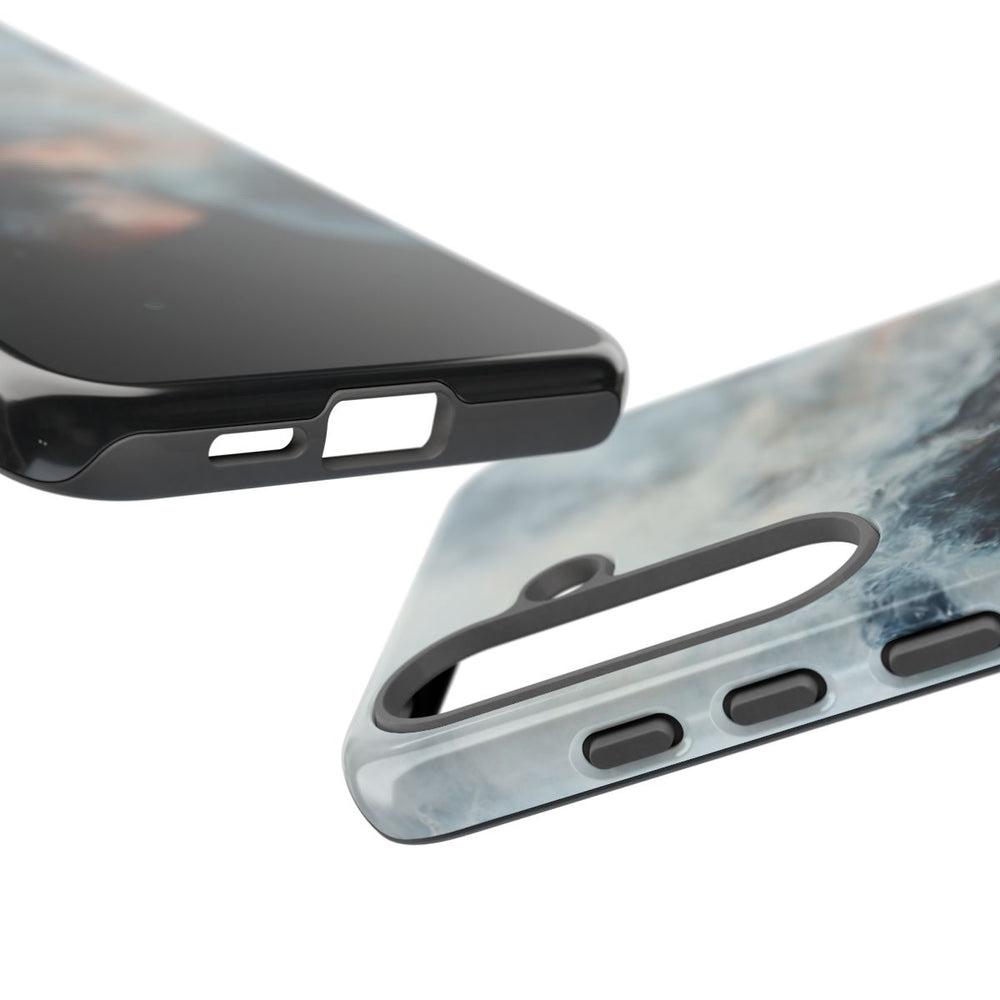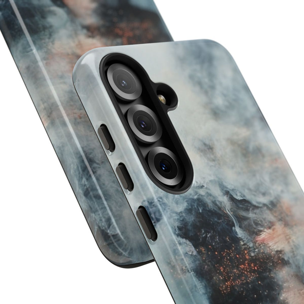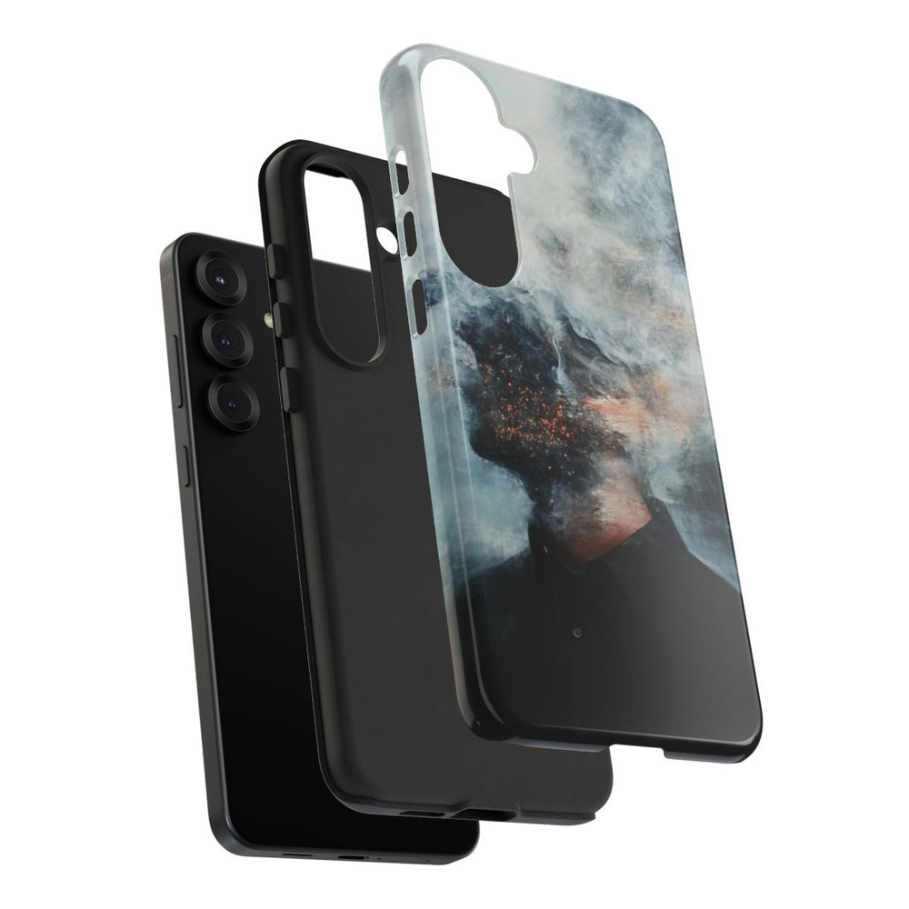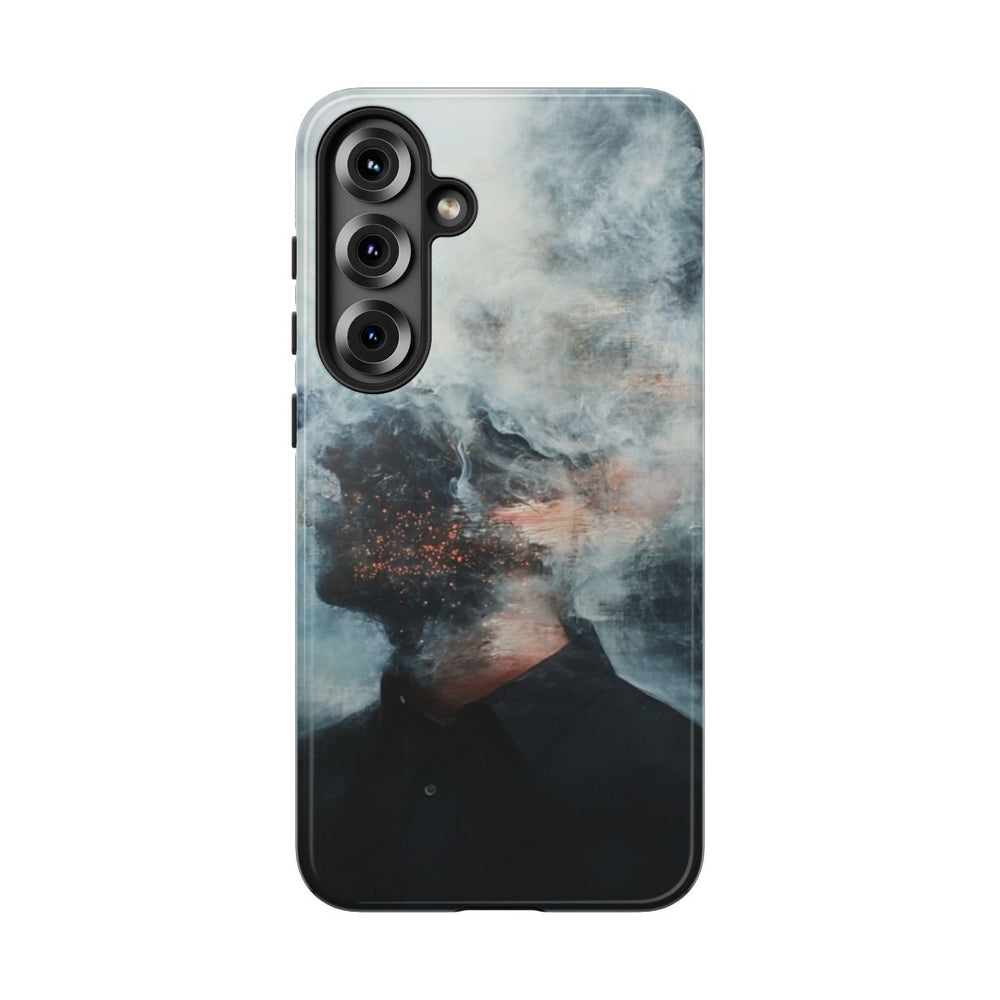 Dit ontwerp toont een donker, abstract portret van een persoon met een zwart shirt. Het gezicht wordt verhuld door dikke, kronkelende rook die overloopt in de donkere achtergrond en zo een mysterieuze, bijna etherische sfeer creëert. Binnen de rook rond het gezicht zijn kleine, gloeiende vonkjes zichtbaar, wat zorgt voor een subtiel contrast. De afbeelding is bedrukt op een glanzend, stevig hoesje met een duurzame polycarbonaat buitenkant en een TPU binnenzijde, speciaal ontworpen voor extra bescherming en bestand tegen gebruik buitenshuis.