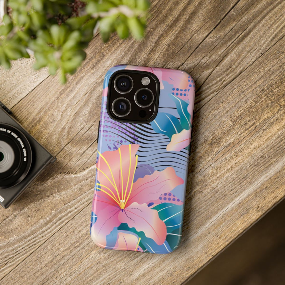 Dit hoesje heeft een opvallend ontwerp met grote roze bloemen met gele meeldraden en groenblauwe bladeren, geplaatst op een abstracte achtergrond. De achtergrond bestaat uit zachte blauwe en paarse vormen met gestippelde patronen en zwarte golvende lijnen, wat zorgt voor een dynamische en moderne uitstraling. Het geheel is levendig en kleurrijk, waarbij bloemmotieven worden gecombineerd met abstracte elementen. Het hoesje is glanzend en stevig, gemaakt van polycarbonaat en TPU voor dubbele bescherming en geschikt voor draadloos opladen.