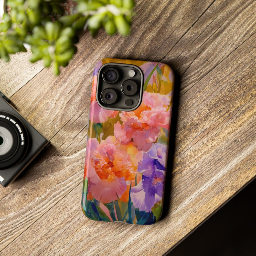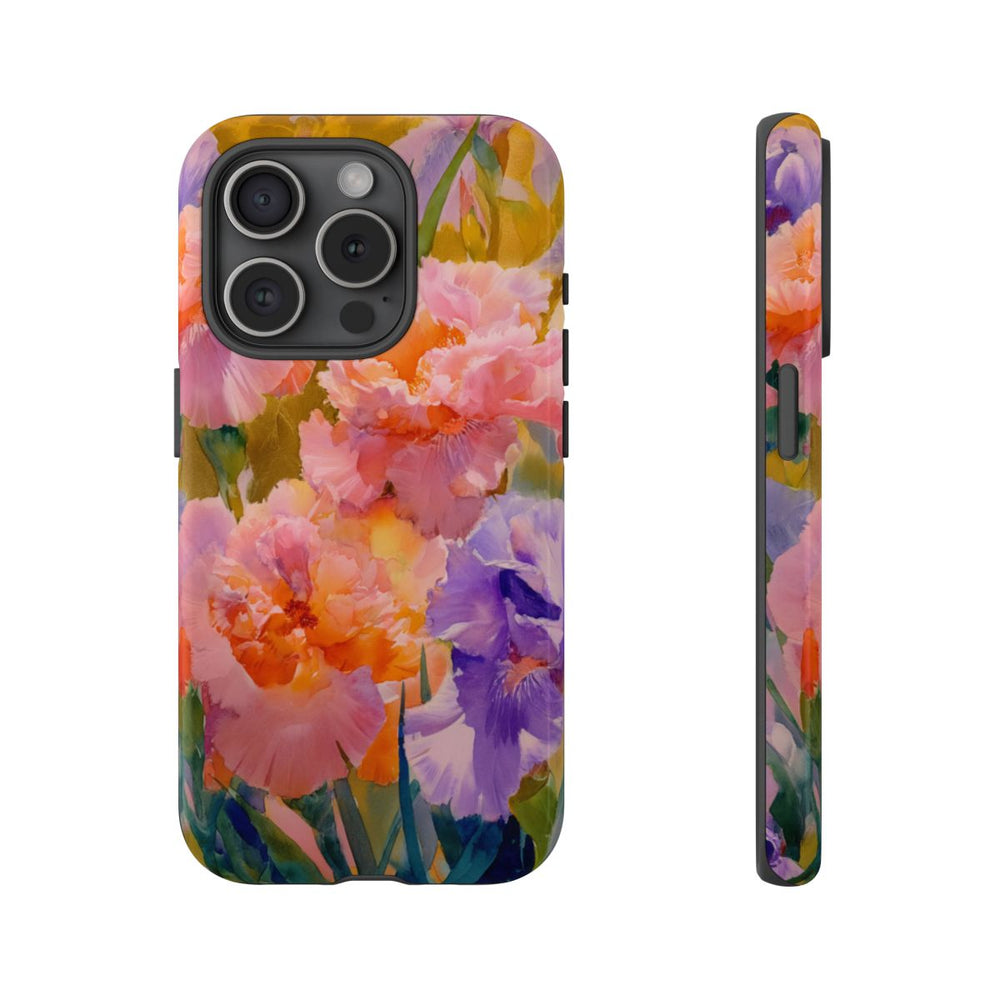 Dit telefoonhoesje is bedrukt met een levendige aquarel van grote roze en oranje pioenen, gecombineerd met paarse irissen. De bloemen komen mooi naar voren tegen een diep gouden achtergrond, wat zorgt voor een warme en speelse uitstraling. Het ontwerp kenmerkt zich door zachte, vloeiende penseelstreken en heldere kleuren die naadloos in elkaar overlopen. Het hoesje heeft een glanzende afwerking en bestaat uit twee lagen: een stevige polycarbonaat buitenkant en een TPU binnenzijde. Hierdoor biedt het hoesje uitstekende bescherming en is het geschikt voor draadloos opladen.