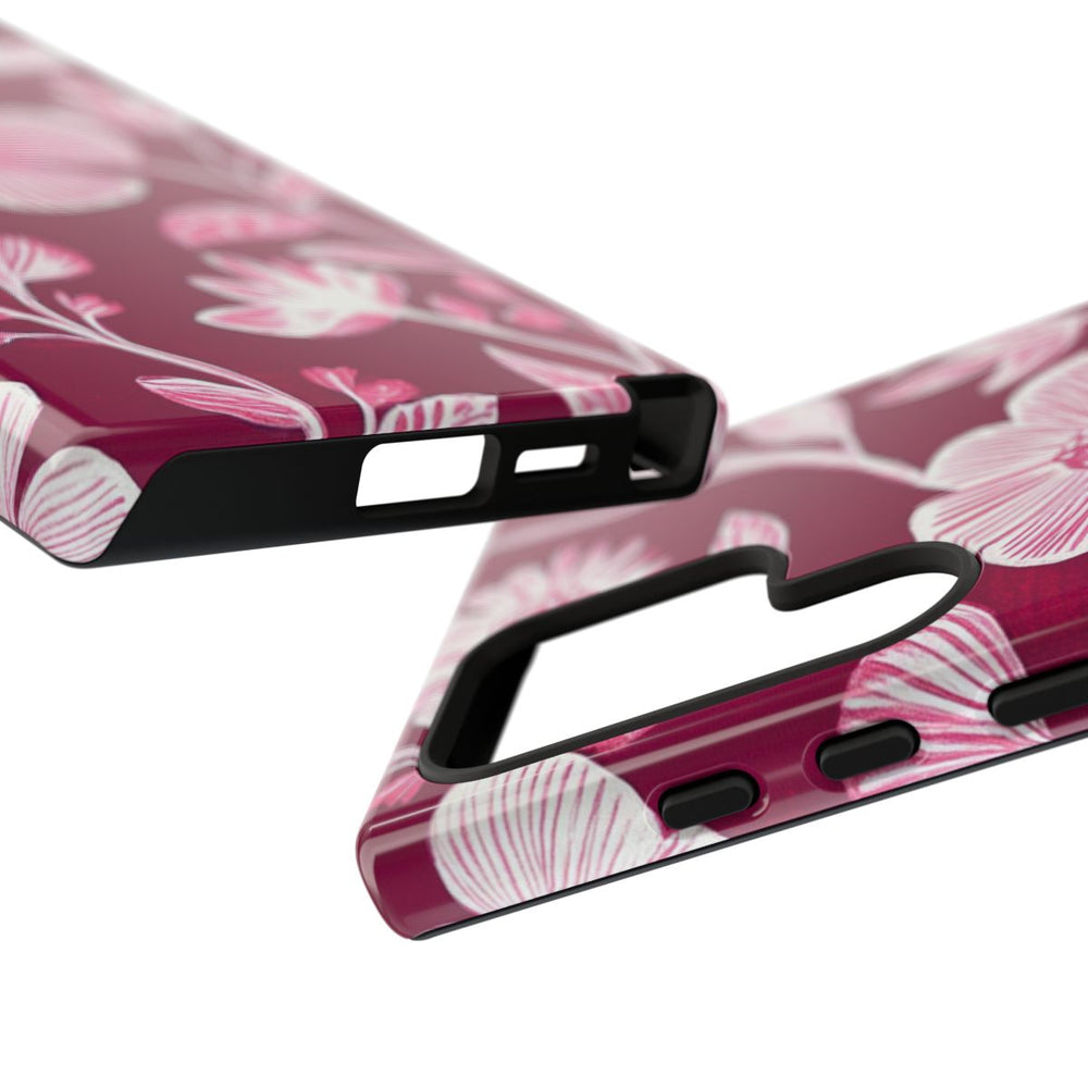 Dit hoesje heeft een naadloos bloemenpatroon met witte en roze bloemen en bladeren op een dieprode achtergrond. De bloemen verschillen in vorm en grootte, waarbij de fijne lijntjes de bloemblaadjes en bladeren extra accentueren. Het patroon is gelijkmatig verdeeld, wat zorgt voor een harmonieuze en elegante uitstraling. Het glanzende, stevige hoesje bestaat uit een dubbele laag met een polycarbonaat buitenkant en een TPU binnenzijde. Dit biedt uitstekende bescherming en stevigheid, terwijl draadloos opladen mogelijk blijft.