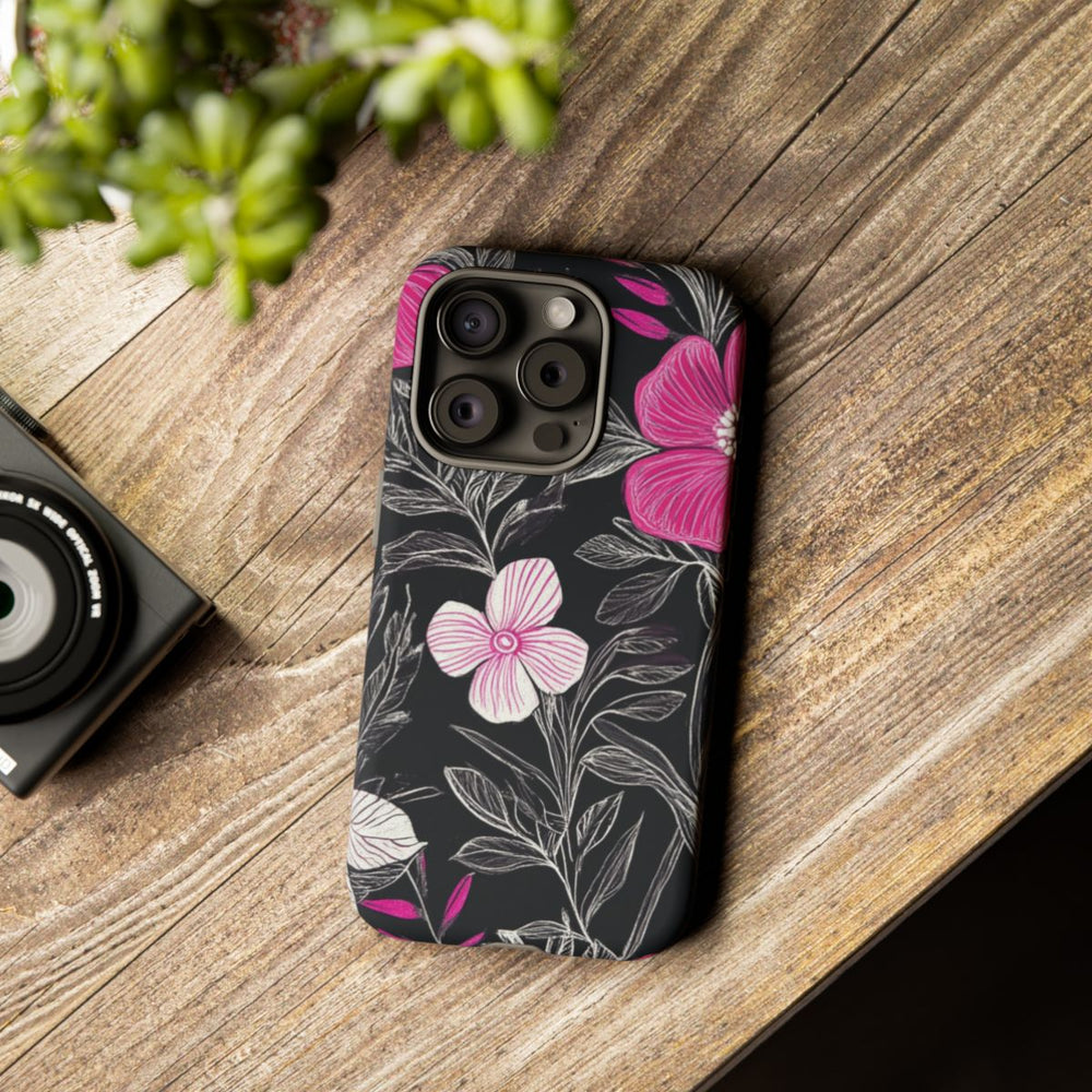 Dit hoesje is voorzien van een naadloos bloemenpatroon met grote felroze bloemen en kleinere witte bloemen met een lichtroze omlijning. De bloemen worden omringd door sierlijke bladeren en stelen in witte en lichtroze lijntekeningen, geplaatst op een diepzwarte achtergrond. Het gedetailleerde en elegante ontwerp zorgt voor een opvallend contrast met de donkere ondergrond. Het hoesje bestaat uit twee lagen met een matte afwerking: een stevige polycarbonaat buitenkant en een TPU-binnenzijde. Dit zorgt voor extra stevigheid en bescherming, ook buitenshuis. Het hoesje ondersteunt draadloos opladen.