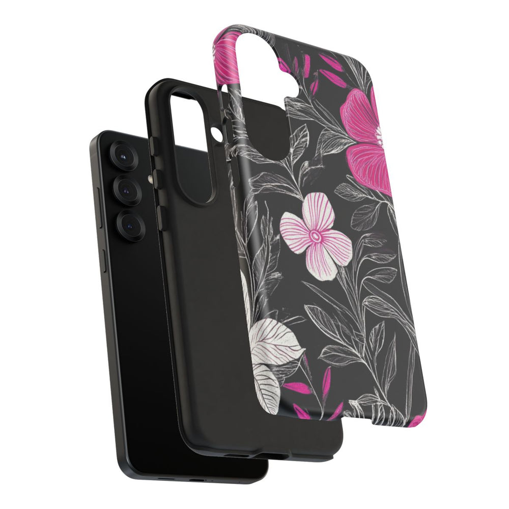 Dit hoesje is voorzien van een naadloos bloemenpatroon met grote felroze bloemen en kleinere witte bloemen met een lichtroze omlijning. De bloemen worden omringd door sierlijke bladeren en stelen in witte en lichtroze lijntekeningen, geplaatst op een diepzwarte achtergrond. Het gedetailleerde en elegante ontwerp zorgt voor een opvallend contrast met de donkere ondergrond. Het hoesje bestaat uit twee lagen met een matte afwerking: een stevige polycarbonaat buitenkant en een TPU-binnenzijde. Dit zorgt voor extra stevigheid en bescherming, ook buitenshuis. Het hoesje ondersteunt draadloos opladen.