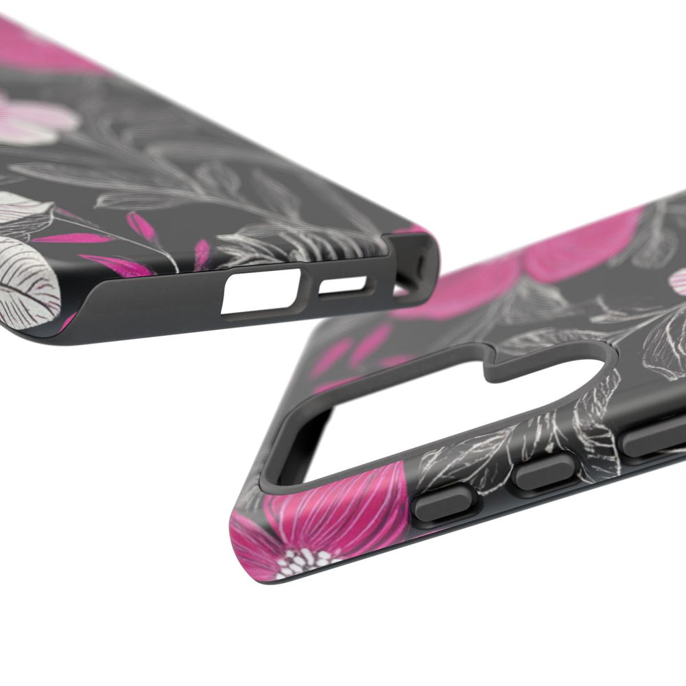 Dit hoesje is voorzien van een naadloos bloemenpatroon met grote felroze bloemen en kleinere witte bloemen met een lichtroze omlijning. De bloemen worden omringd door sierlijke bladeren en stelen in witte en lichtroze lijntekeningen, geplaatst op een diepzwarte achtergrond. Het gedetailleerde en elegante ontwerp zorgt voor een opvallend contrast met de donkere ondergrond. Het hoesje bestaat uit twee lagen met een matte afwerking: een stevige polycarbonaat buitenkant en een TPU-binnenzijde. Dit zorgt voor extra stevigheid en bescherming, ook buitenshuis. Het hoesje ondersteunt draadloos opladen.