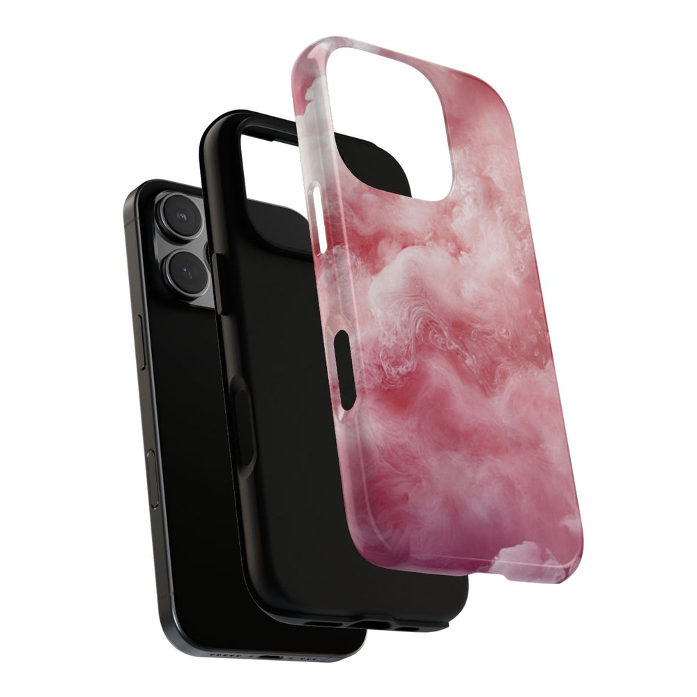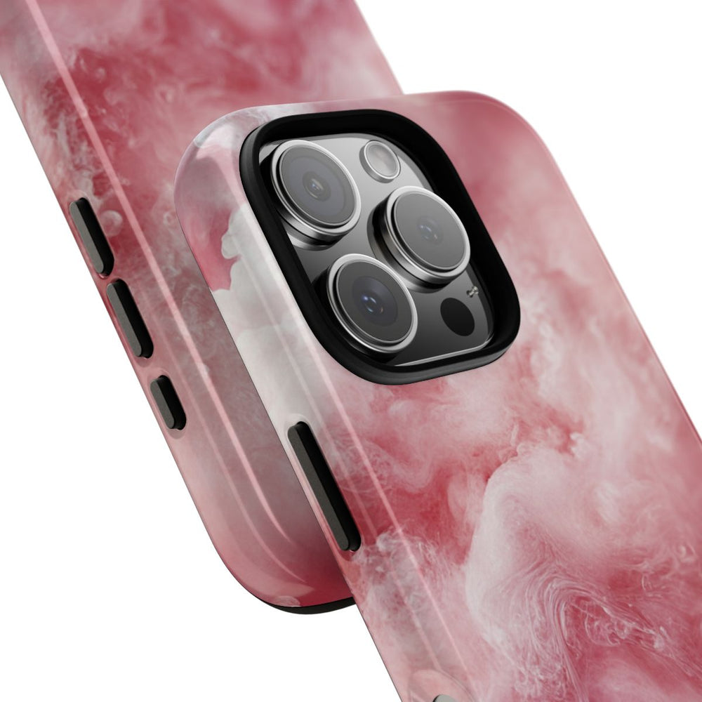 Dit ontwerp toont een zachte, golvende structuur van roze en witte wolken die naadloos in elkaar overlopen. Het beeld zorgt voor een dromerig en luchtig effect met fijne slierten en krullen van mistige vormen. Het hoesje heeft een glanzende afwerking en is extra stevig dankzij de dubbele laag van een polycarbonaat buitenkant en een TPU binnenzijde. Dit biedt uitstekende duurzaamheid en bescherming. Het hoesje ondersteunt draadloos opladen en behoudt langdurig zijn optische kwaliteit, met uitstekende weerstand tegen weersinvloeden.