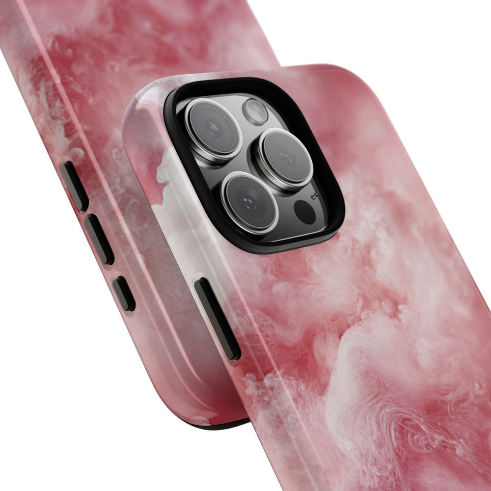 Dit ontwerp toont een zachte, golvende structuur van roze en witte wolken die naadloos in elkaar overlopen. Het beeld zorgt voor een dromerig en luchtig effect met fijne slierten en krullen van mistige vormen. Het hoesje heeft een glanzende afwerking en is extra stevig dankzij de dubbele laag van een polycarbonaat buitenkant en een TPU binnenzijde. Dit biedt uitstekende duurzaamheid en bescherming. Het hoesje ondersteunt draadloos opladen en behoudt langdurig zijn optische kwaliteit, met uitstekende weerstand tegen weersinvloeden.