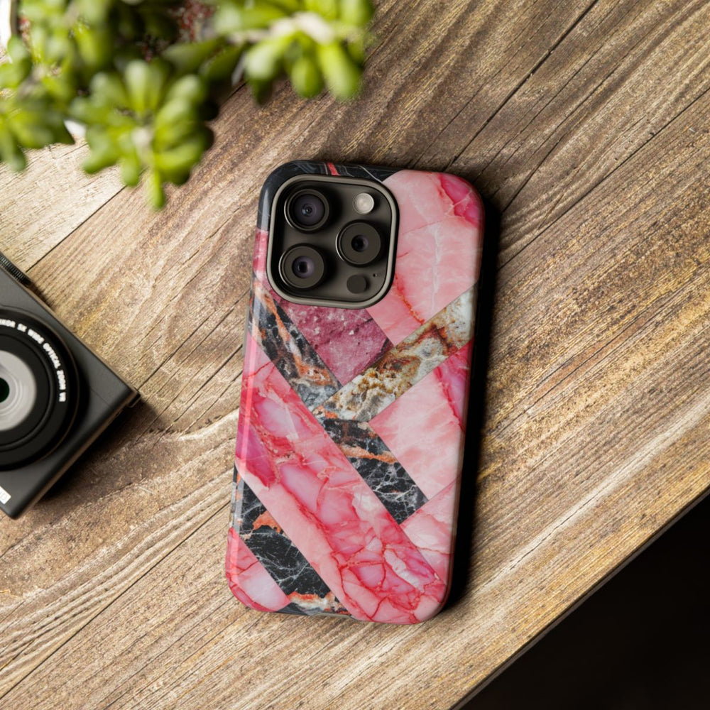 Dit hoesje heeft een opvallend geometrisch patroon van roze en zwart marmer. De roze vlakken hebben een doorschijnende, edelsteenachtige uitstraling met fijne aders, terwijl de zwarte delen glad en gelaagd zijn met subtiele roze lijnen. Het patroon is diagonaal en in elkaar grijpende vormen aangebracht, wat zorgt voor een moderne en gedurfde uitstraling. Het hoesje bestaat uit twee lagen: een stevige polycarbonaat buitenkant en een TPU binnenzijde voor extra stevigheid en bescherming. Geschikt voor draadloos opladen.