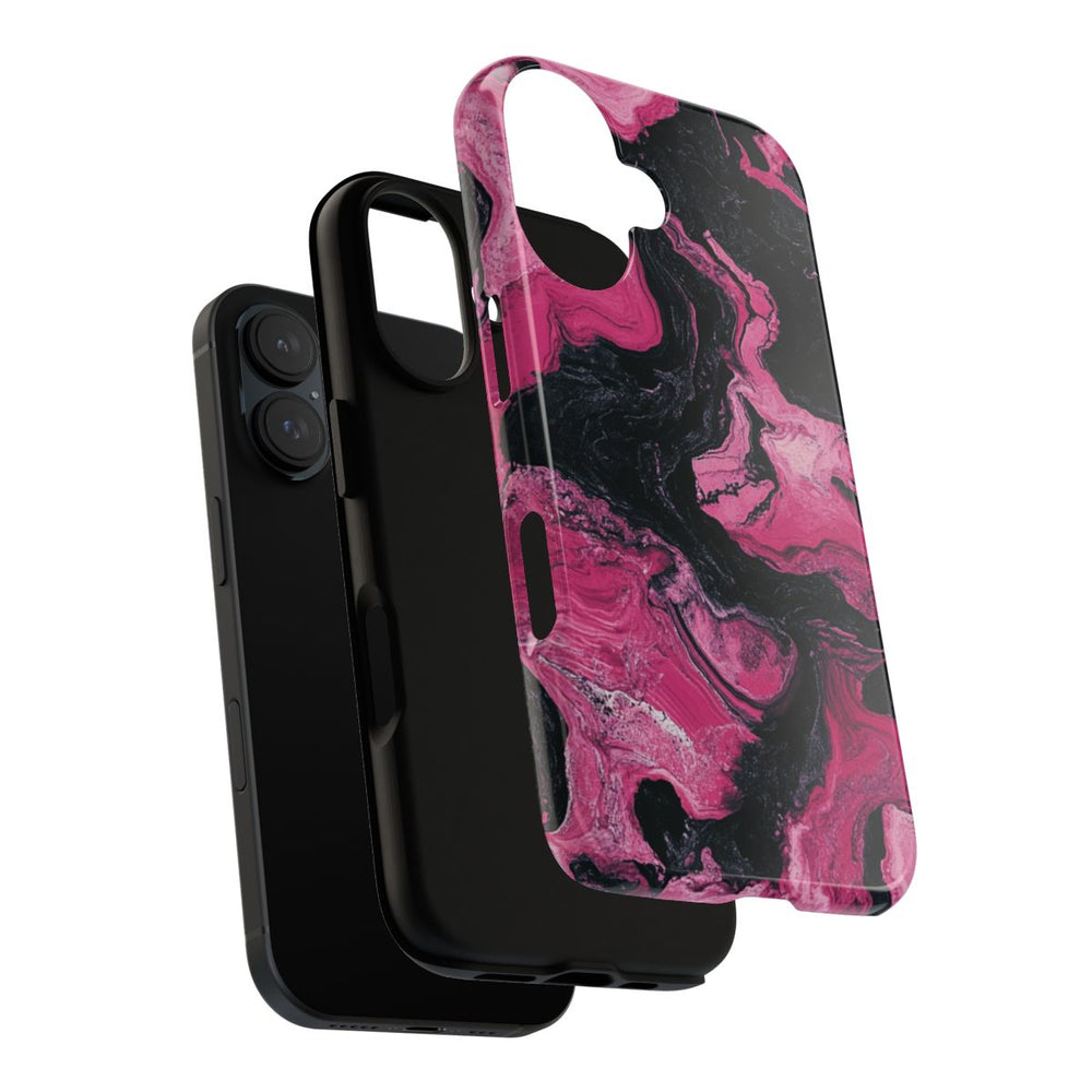 Dit hoesje heeft een naadloze marmertextuur met golvende patronen in levendig roze en diepzwarte tinten. Het abstracte ontwerp zorgt voor een dynamische en vloeiende uitstraling, waarbij verschillende roze schakeringen mooi overlopen in de zwarte delen. Het hoesje is glanzend en extra stevig dankzij een buitenkant van 100% polycarbonaat en een binnenzijde van 100% TPU, wat zorgt voor dubbele bescherming. Geschikt voor draadloos opladen en bestand tegen weersinvloeden, zodat de heldere uitstraling langdurig behouden blijft.