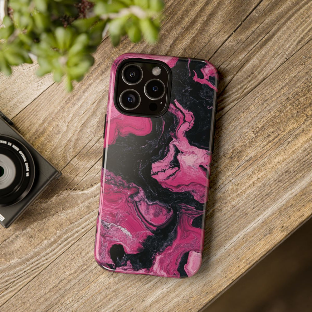 Dit hoesje heeft een naadloze marmertextuur met golvende patronen in levendig roze en diepzwarte tinten. Het abstracte ontwerp zorgt voor een dynamische en vloeiende uitstraling, waarbij verschillende roze schakeringen mooi overlopen in de zwarte delen. Het hoesje is glanzend en extra stevig dankzij een buitenkant van 100% polycarbonaat en een binnenzijde van 100% TPU, wat zorgt voor dubbele bescherming. Geschikt voor draadloos opladen en bestand tegen weersinvloeden, zodat de heldere uitstraling langdurig behouden blijft.