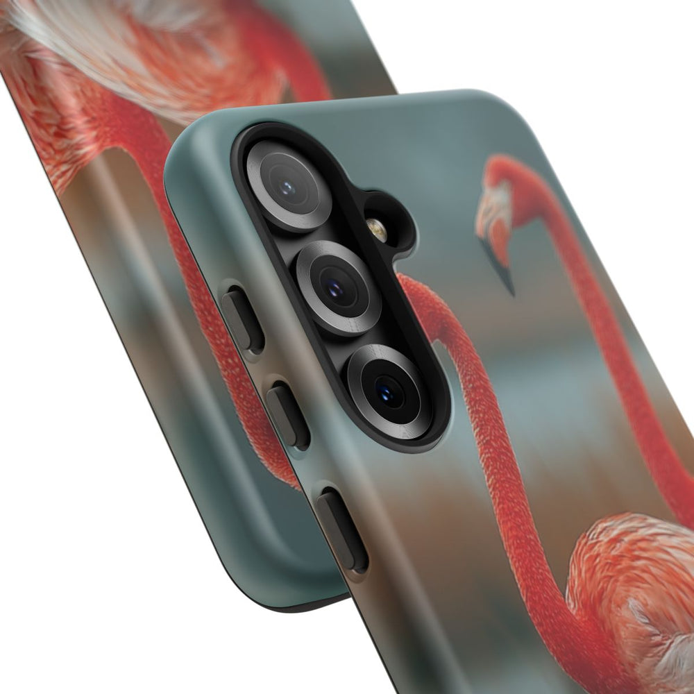 Dit telefoonhoesje toont drie roze flamingo's die in ondiep water staan, omringd door hoge bruine grassprieten. Op de achtergrond is een vervaagd landschap te zien met zachte blauw- en grijstinten, wat zorgt voor een rustige en natuurlijke uitstraling. De flamingo's zijn gedetailleerd afgebeeld met levendige roze en witte veren. Het ontwerp is gedrukt op een mat, stevig hoesje met een polycarbonaat buitenkant en een TPU binnenzijde. Het hoesje is geschikt voor draadloos opladen en speciaal ontworpen voor de Galaxy S25.
