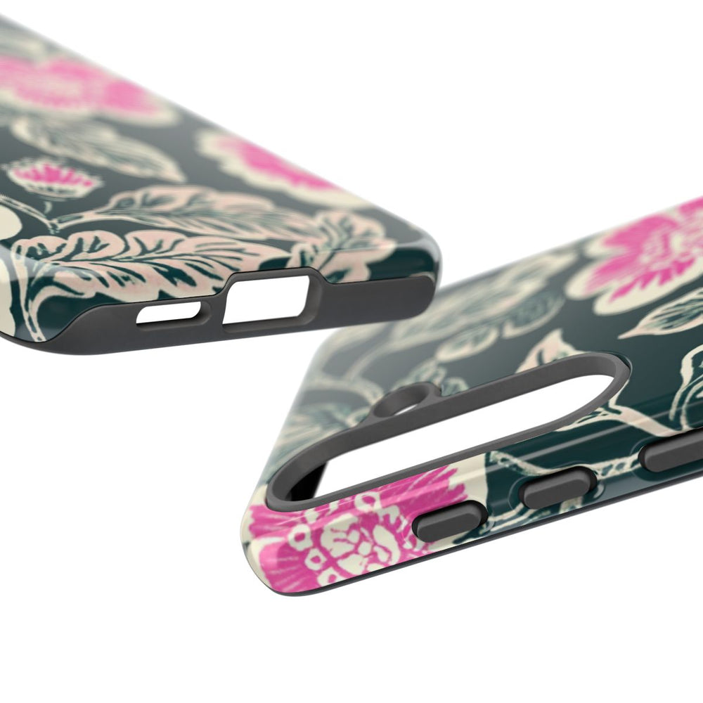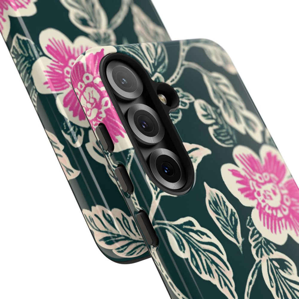 Dit hoesje heeft een naadloos bloemenpatroon met felroze bloemen en lichtroze bladeren op een donkergroene achtergrond. De bloemen zijn voorzien van opvallende, gestileerde bloemblaadjes met fijne lijnaccenten, wat zorgt voor een geblokt drukeffect. Het patroon wordt gelijkmatig herhaald voor een evenwichtige en artistieke uitstraling. Het hoesje heeft een glanzende afwerking en is extra stevig dankzij de dubbele laag van een polycarbonaat buitenkant en een TPU binnenzijde. Het biedt uitstekende bescherming, ondersteunt draadloos opladen en is bestand tegen weersinvloeden.