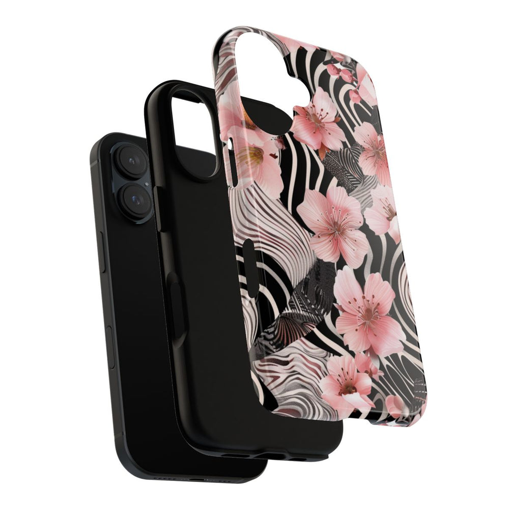Dit hoesje heeft een verfijnd ontwerp met roze kersenbloesems die speels verspreid zijn over een dynamisch zwart-wit abstract patroon. De achtergrond bestaat uit golvende lijnen en geometrische vormen in tinten zwart, wit en grijs, wat zorgt voor een opvallend contrast met de zachte bloemen. Het glanzende, stevige hoesje is opgebouwd uit twee lagen: een polycarbonaat buitenkant en een TPU binnenzijde. Dit zorgt voor extra bescherming en maakt het hoesje geschikt voor gebruik buitenshuis. Daarnaast ondersteunt het draadloos opladen.
