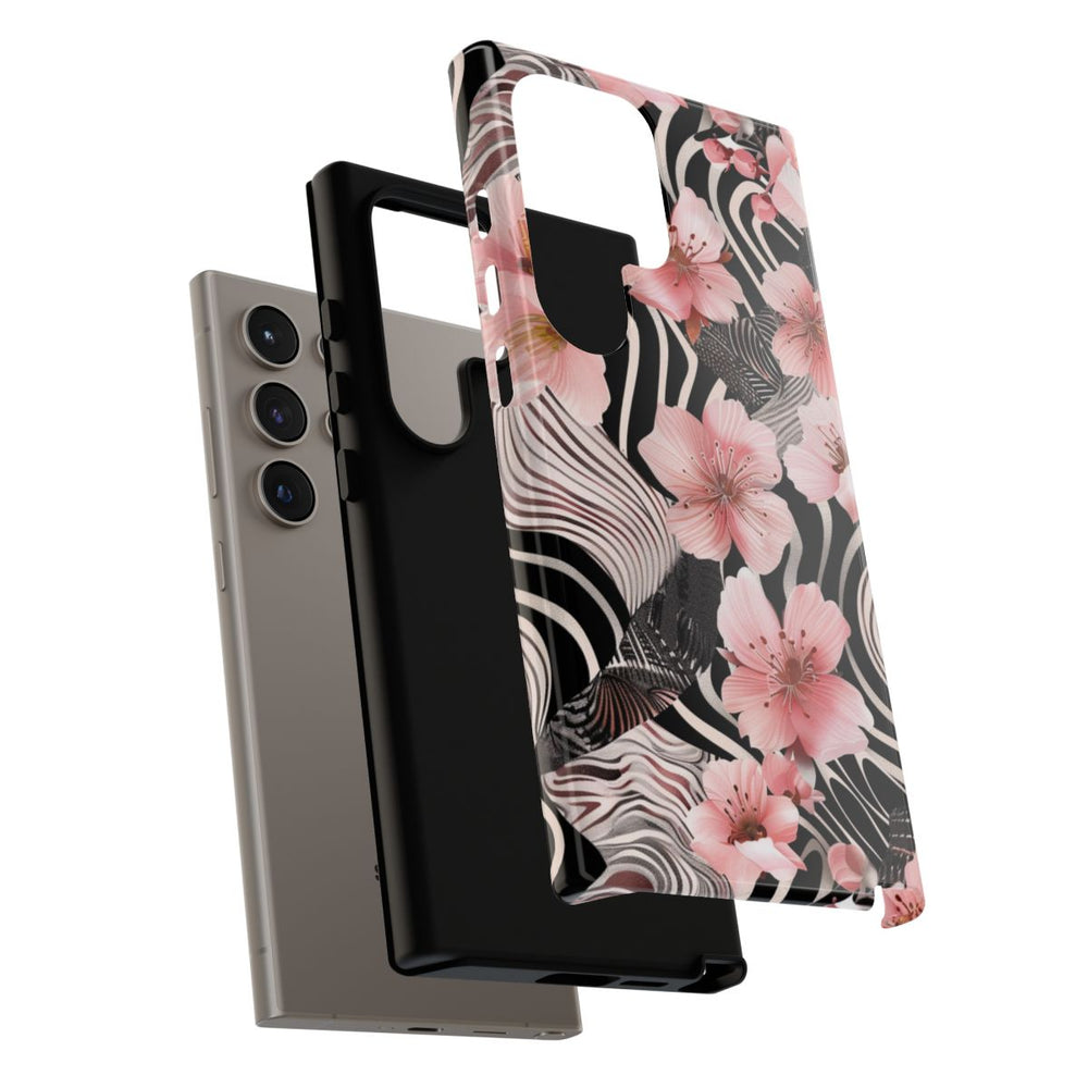 Dit hoesje heeft een verfijnd ontwerp met roze kersenbloesems die speels verspreid zijn over een dynamisch zwart-wit abstract patroon. De achtergrond bestaat uit golvende lijnen en geometrische vormen in tinten zwart, wit en grijs, wat zorgt voor een opvallend contrast met de zachte bloemen. Het glanzende, stevige hoesje is opgebouwd uit twee lagen: een polycarbonaat buitenkant en een TPU binnenzijde. Dit zorgt voor extra bescherming en maakt het hoesje geschikt voor gebruik buitenshuis. Daarnaast ondersteunt het draadloos opladen.